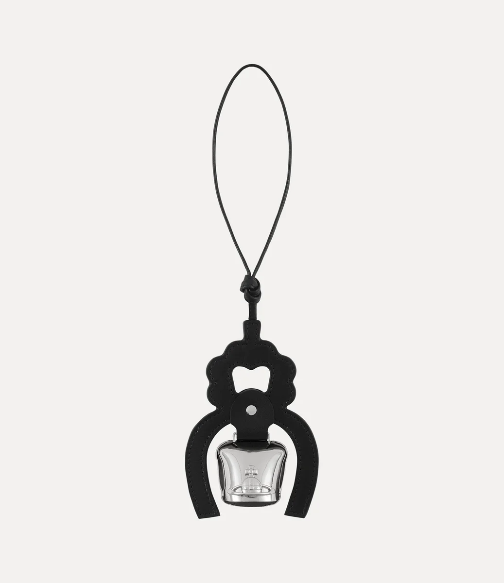 Brelok Vivienne Westwood Bell ma centralny dzwonek w skórzanej ramce w kształcie podkowy, jest bezpiecznie zapinany na pętelkę i ma trójwymiarowe wykończenie w kształcie kuli.