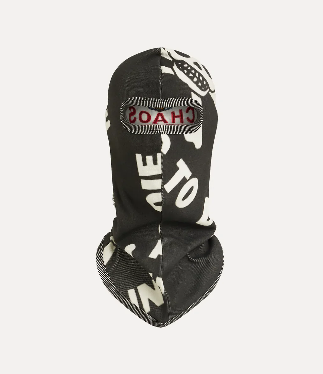 - Kontrastowy motyw „CHAOS” wyhaftowany nad otworem na oczy