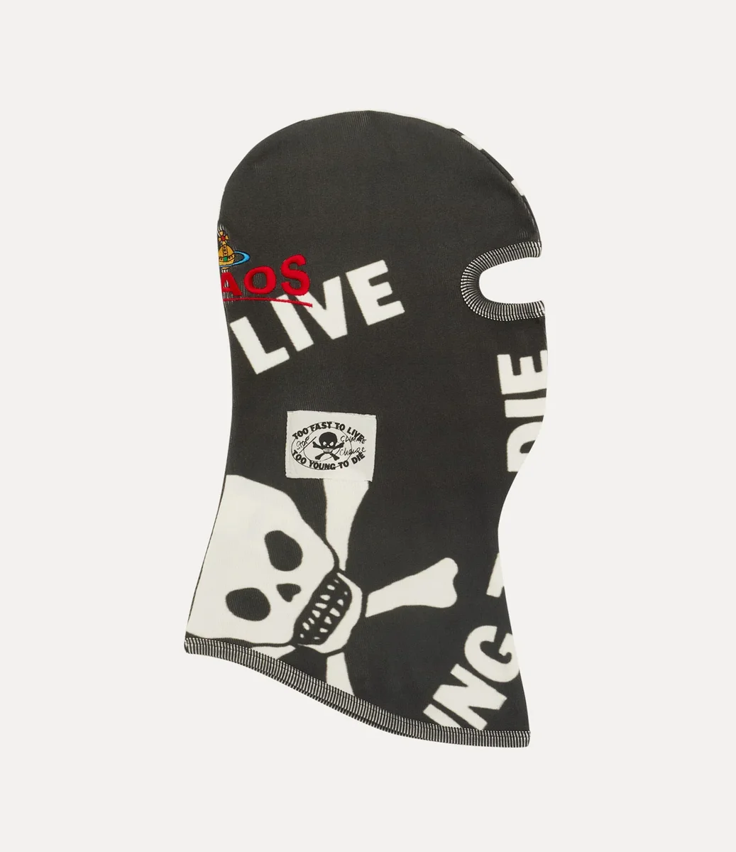 Nasza maska Worlds End Storm jest wykonana z miękkiej, elastycznej dzianiny, która zapewnia idealne dopasowanie i oferuje wyprofilowany krój, całkowicie zakrywający głowę i szyję. Model charakteryzuje się odważnym, monochromatycznym wzorem czaszki i skrzyżowanych kości, który nawiązuje do charakterystycznej dla Vivienne estetyki punkowej.