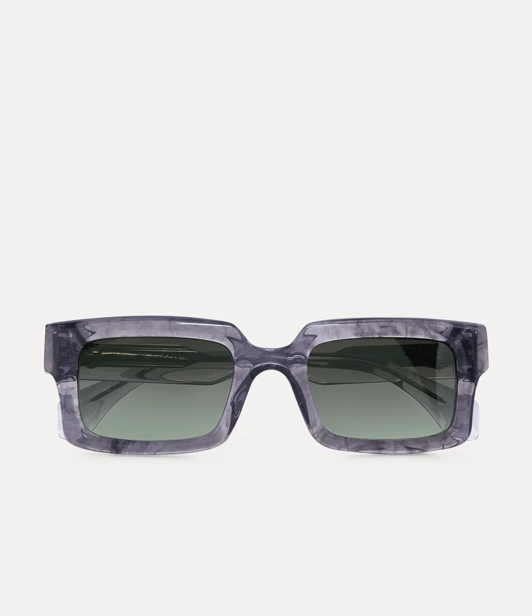 Okulary przeciwsłoneczne Costello charakteryzują się odważną i ponadczasową estetyką, inspirowaną legendarnymi postaciami kultury scenicznej i filmowej. Model ten ma kwadratową oprawkę z soczewkami o stopniowanej mocy i jest wykończony szarym acetatem imitującym marmur, ozdobionym polerowanymi akcentami z rogu na zewnętrznej krawędzi – nawiązującymi do kultowej opaski Horn Alice marki Vivienne.
