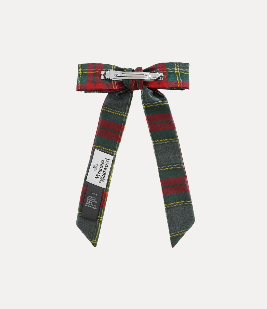 Spinka do włosów Flyes ma oversize’owy kształt kokardki, ozdobiony motywem tartanu „Scarlet”. Warstwowa kokardka jest ręcznie wykończona klasycznym haftem w kształcie kuli, wykonanym wielobarwną nicią, odzwierciedlającym etos marki, łączący przeszłość z przyszłością.