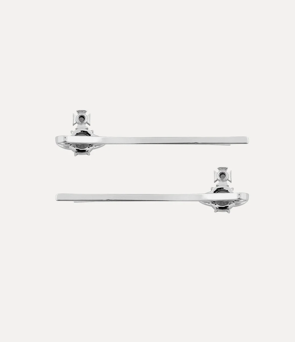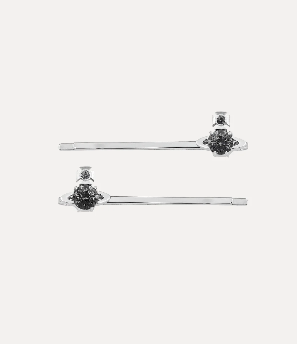 W tym sezonie nasze spinki do włosów Joaquina są dostępne w wersji z polerowanym, srebrnym pokryciem. Projekt charakteryzuje się wyraźną dwuwymiarową kulą pośrodku, inkrustowaną szarymi kryształowymi detalami, nawiązującymi do wizji Vivienne, która przenosi tradycję w przyszłość.