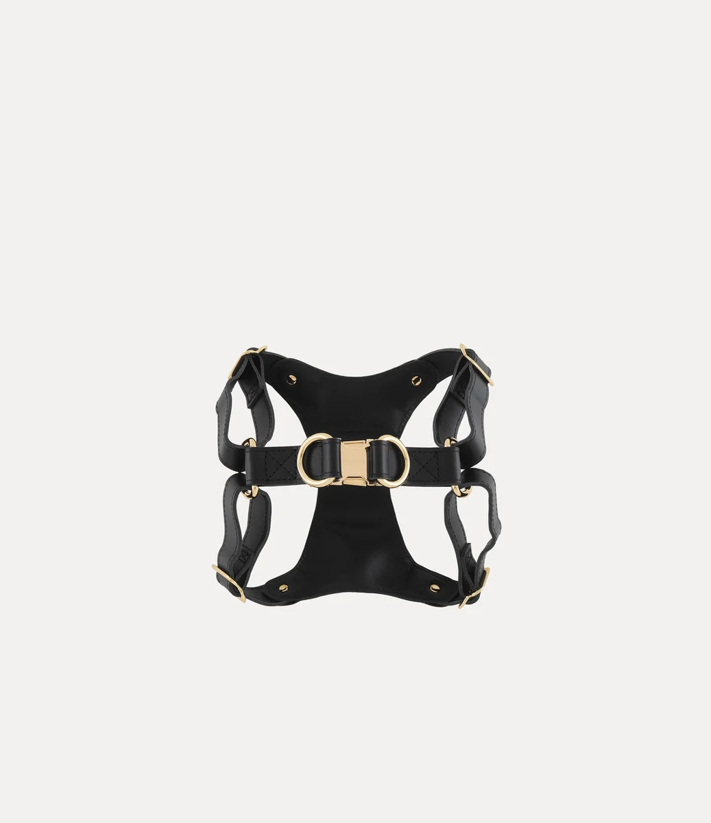 Czerpiąc inspirację z tkaniny Steiff z archiwalnej kolekcji Gold Label na sezon jesień-zima 2001 r. „Wild Beauty”, szelki dla psów mają odważny motyw lamparta. Zaprojektowane z wyprofilowaną płytką na klatkę piersiową i regulowanymi czarnymi paskami, są wykończone polerowanymi złotymi okuciami i charakterystycznym emblematem w kształcie kuli pośrodku.