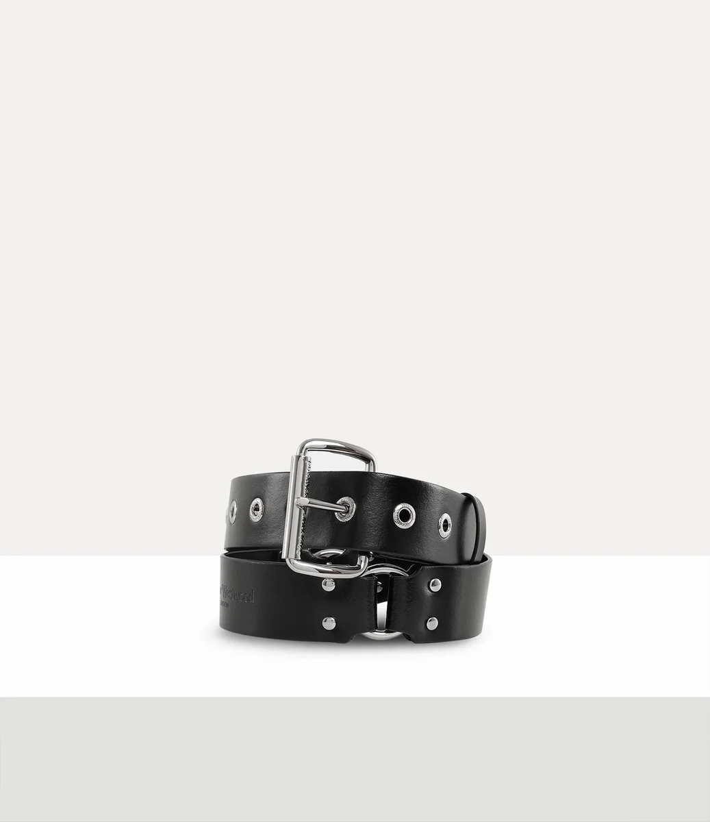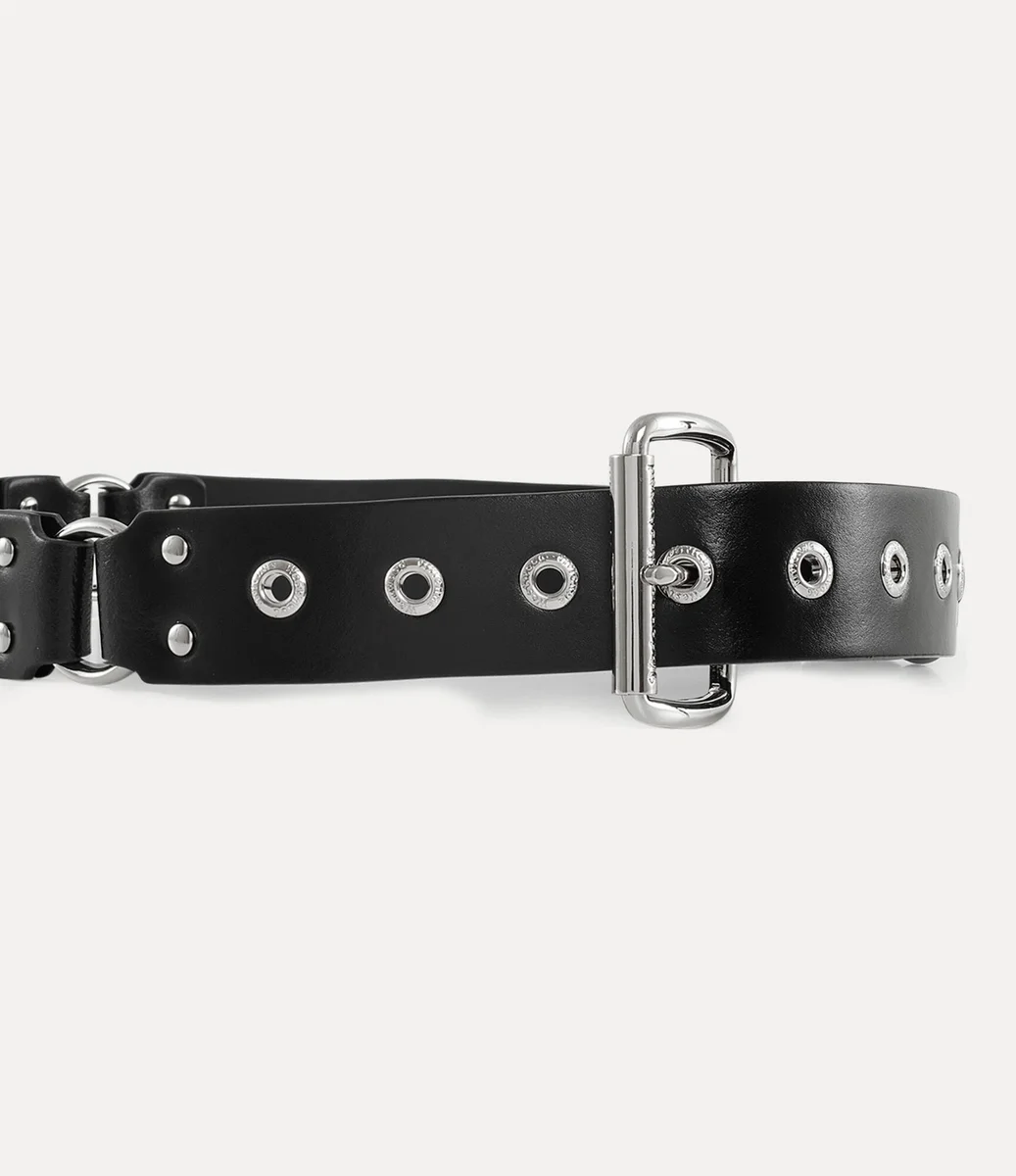 Inspirowany kolekcją Vivienne Westwood „Erotic Zones” z wiosny-lata 1995 r., pasek ten zdobią odważne, inspirowane stylem bondage kółka i wyraziste metalowe okucia. Wypolerowana klamra rolkowa dopełnia projekt, a wygrawerowany napis zdobi oczka.