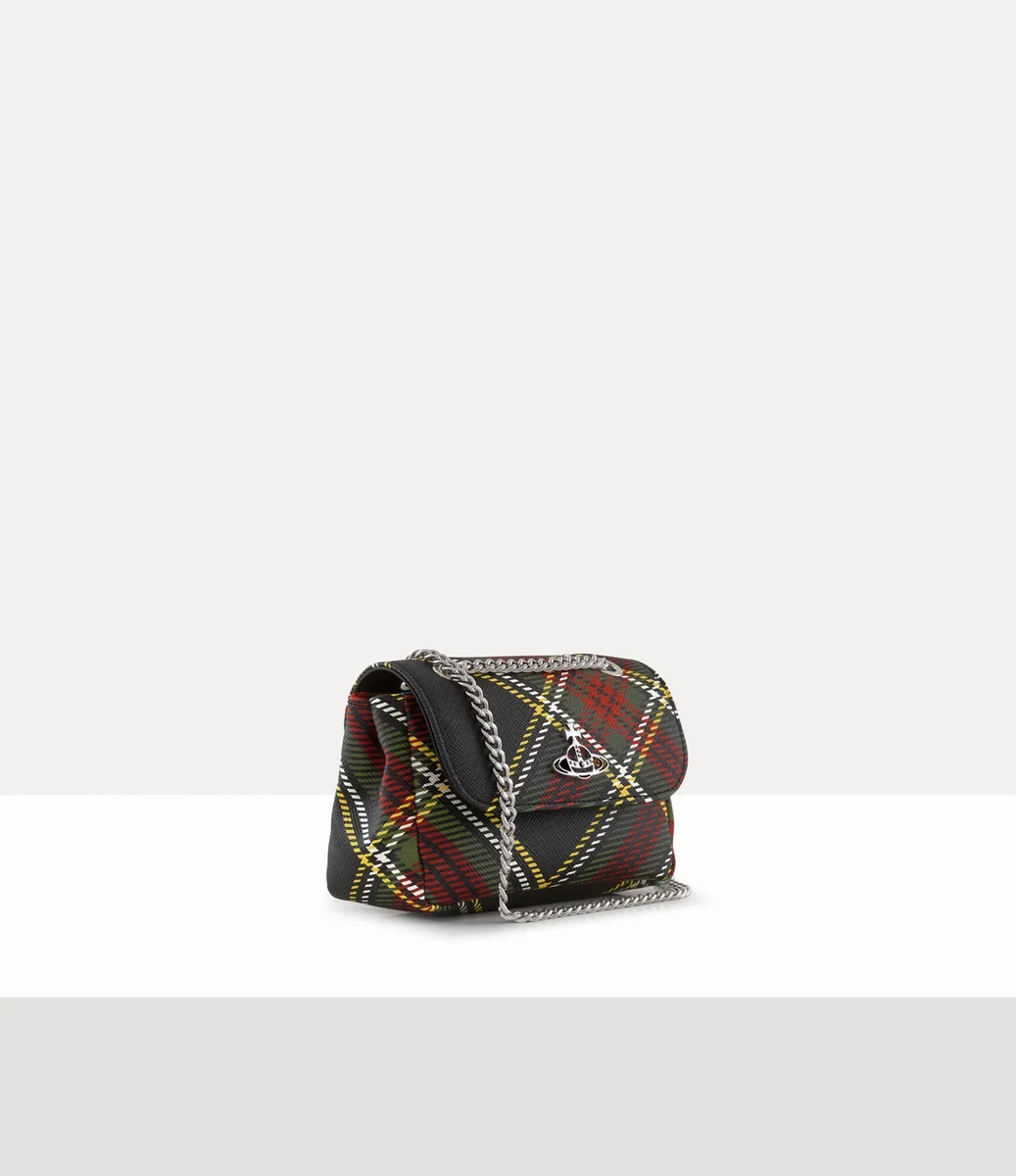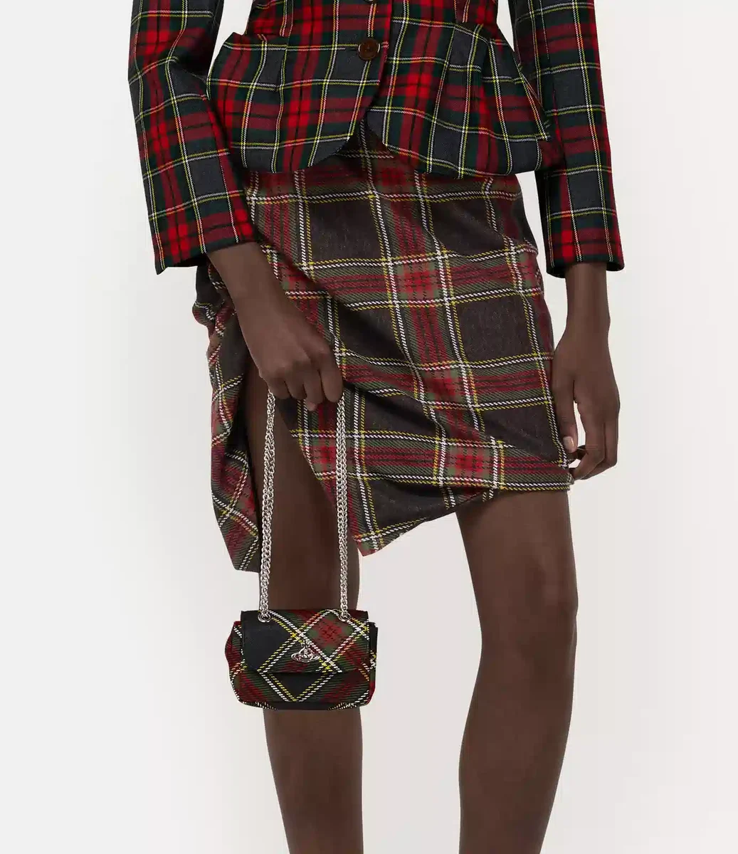 Nasza charakterystyczna mała torebka została wykonana z miękkiej skóry PU i ozdobiona tartanem w żywych kolorach, charakterystycznym dla tego sezonu. Projekt zdobi motyw „Line Orb” marki na przedniej klapie, symbolizujący tradycję, otoczony niebiańskimi pierścieniami Saturna, reprezentującymi przyszłość.