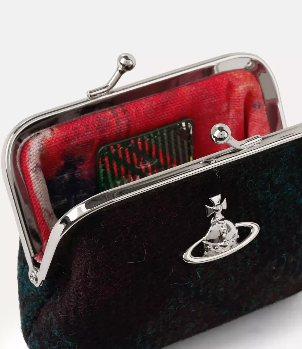 Nasza portmonetka Frame Coin Purse jest ozdobiona motywem ciemnej kratki Harris Tweed, ręcznie tkanej przez mieszkańców szkockich wysp Hebrydy Zewnętrzne i Lewis. Wykończona odsłoniętą złotą ramką i delikatnym zapięciem typu kiss-lock, jej design nawiązuje do vintage’owych portmonetek z początku XX wieku.