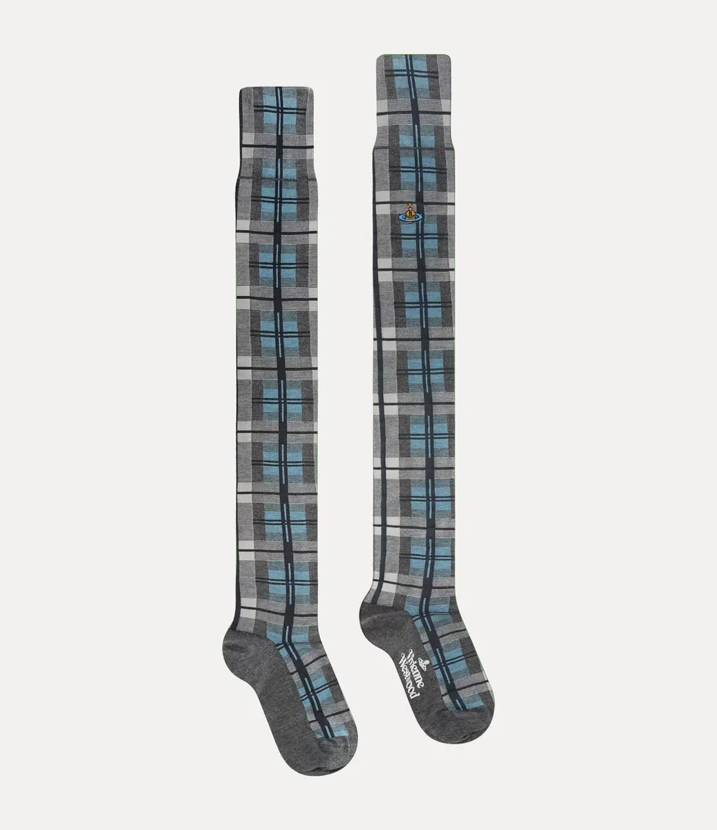 Skarpety Over The Knee są dostępne w tym sezonie w efektownym wzorze tartanu „Moonshine” i zostały wykonane z bardzo delikatnej mieszanki wełny merynosowej. Całość dopełnia haftowany motyw kuli w wielobarwnej nici, symbolizujący tradycję, otoczony pierścieniami Saturna, symbolizującymi przyszłość.