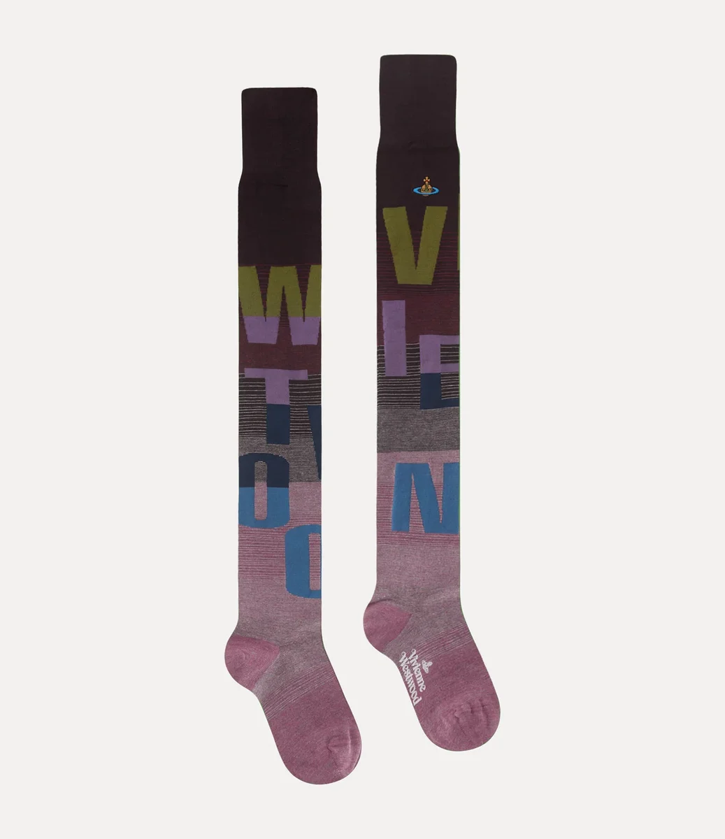 Skarpety Over The Knee mają w tym sezonie efektowny wzór żakardowy „Logomania” i są wykonane z bardzo delikatnej mieszanki wełny merynosowej. Całość dopełnia haftowany motyw kuli w wielobarwnej nici, symbolizujący tradycję, otoczony pierścieniami Saturna, symbolizującymi przyszłość.