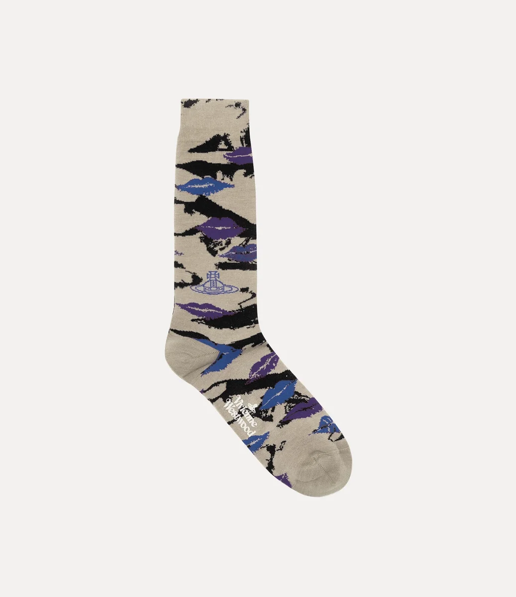 Nasze skarpety mają dzianinową podstawę żakardową, pokrytą grafiką „Kisses” przedstawiającą szminkę – po raz pierwszy pojawiającą się na opakowaniu perfum Boudoir tej marki – tworzącą abstrakcyjny wzór kamuflażu. Wykonane z miękkiej mieszanki bawełny, mają charakterystyczny motyw kuli po bokach.