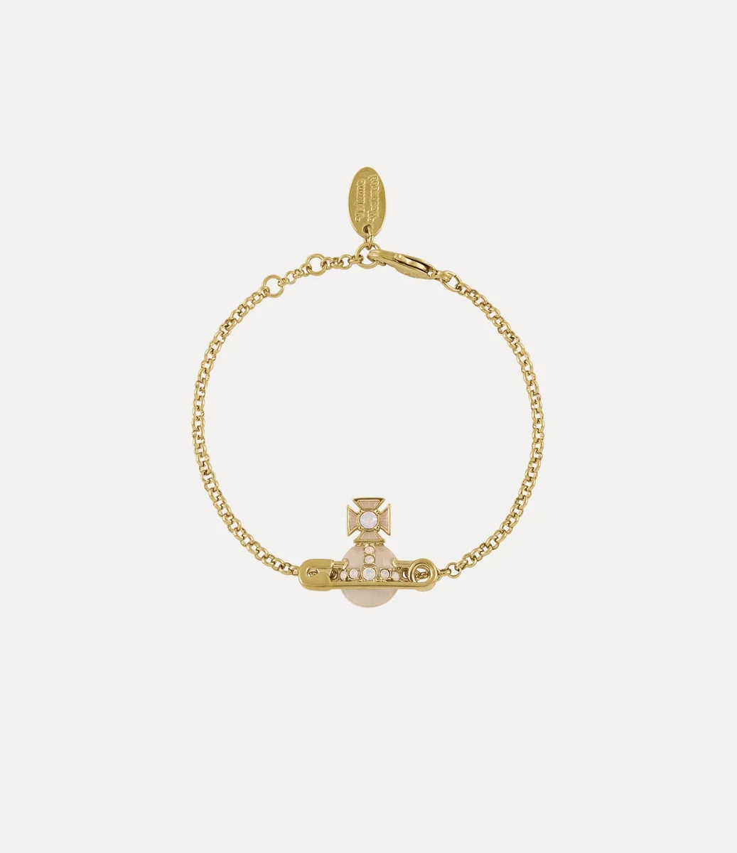 Nasza bransoletka Kitty została w tym sezonie odświeżona dzięki polerowanemu złocistemu pokryciu i klasycznym detalom. Centralny motyw kuli jest podkreślony ręcznie malowaną półprzezroczystą emalią i przebity klasycznym motywem agrafki, nawiązującym do charakterystycznej punkowej estetyki Vivienne.