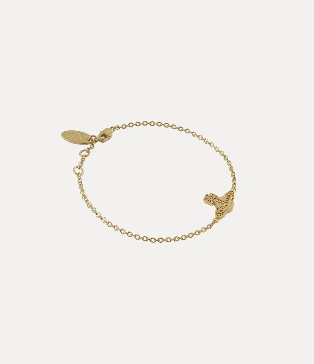 Nasza bransoletka Marinetta jest wykonana z metalu w kolorze złota, a jej centralnym elementem jest charakterystyczny dla marki motyw kuli. Projekt charakteryzuje się delikatnie wytłoczoną fakturą przypominającą koraliki, która nadaje mu ręcznie wykonany wygląd, a wygrawerowane detale podkreślają kontury krzyża i pierścienia Saturna.