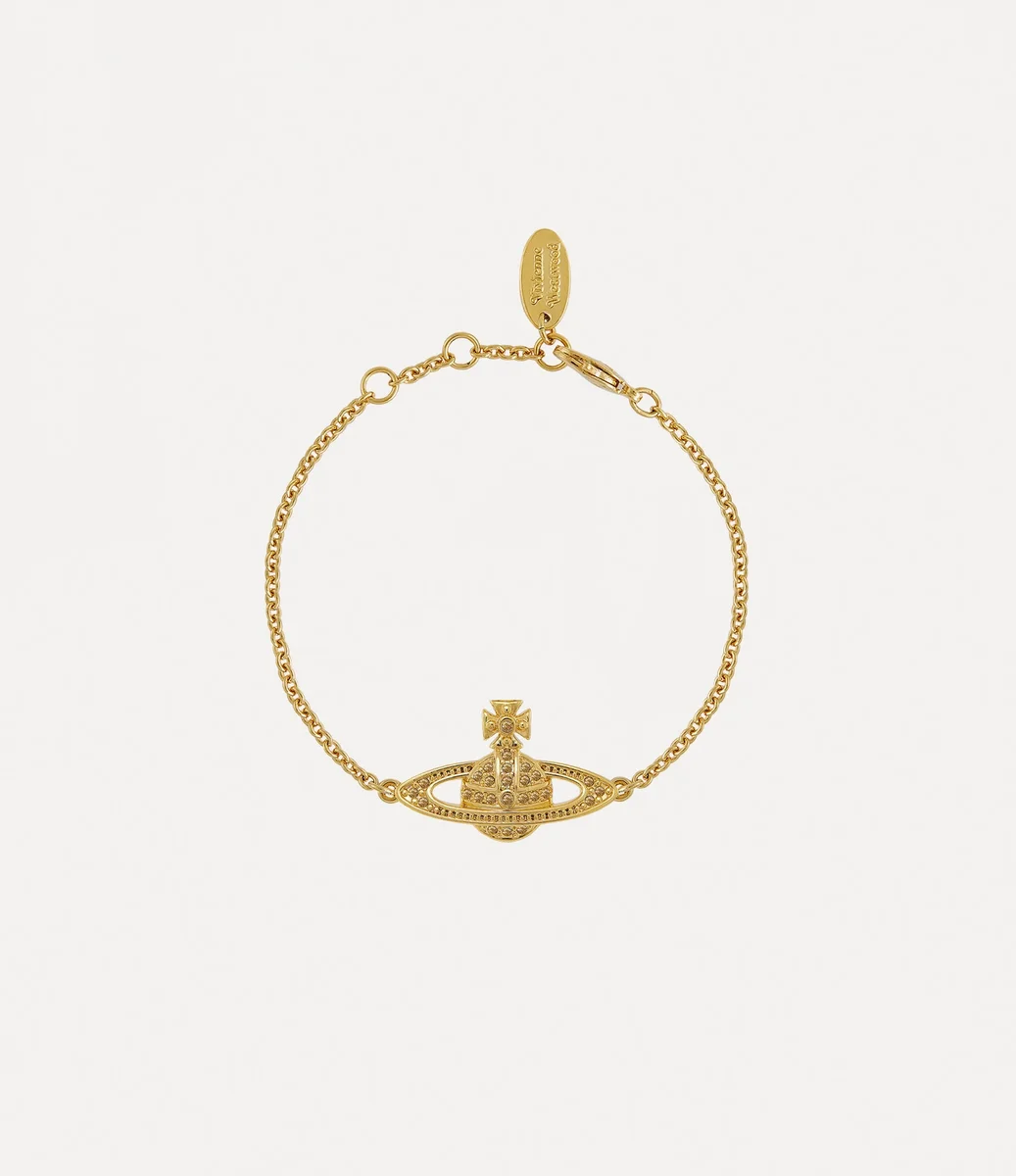Bransoletka z mini płaskorzeźbą jest wykonana z metalu w kolorze złotym i posiada zawieszkę w kształcie kuli pośrodku łańcuszka.