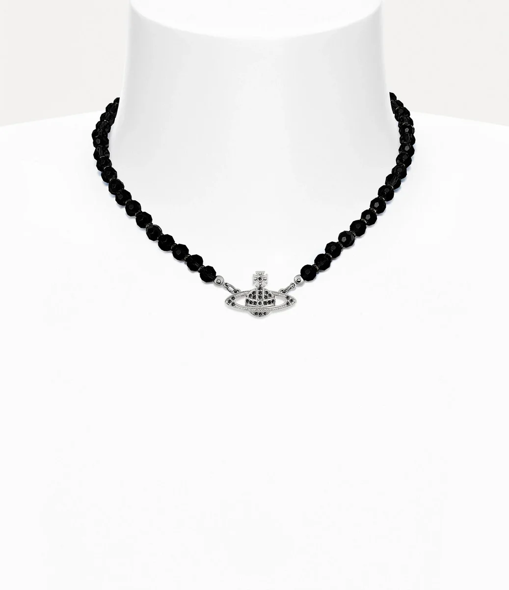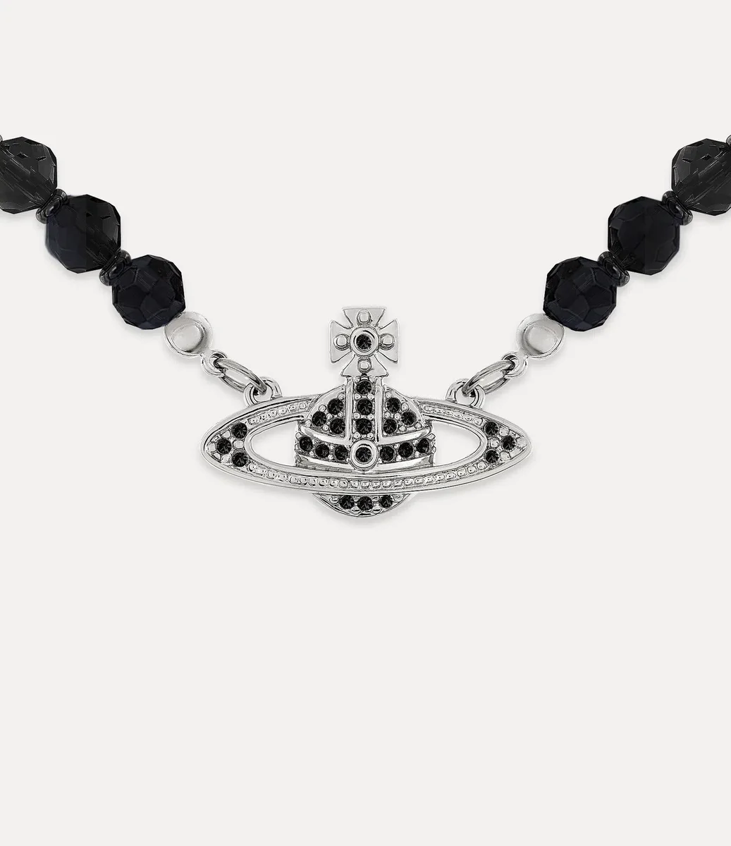 Naszyjnik Messaline marki Vivienne Westwood został przeprojektowany z ręcznie wiązanymi kryształami czarnego agatu i ozdobiony naszym wisiorkiem w kształcie kuli, zdobionym kryształami w kolorze kruczoczarnym.