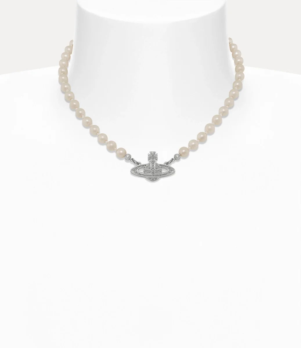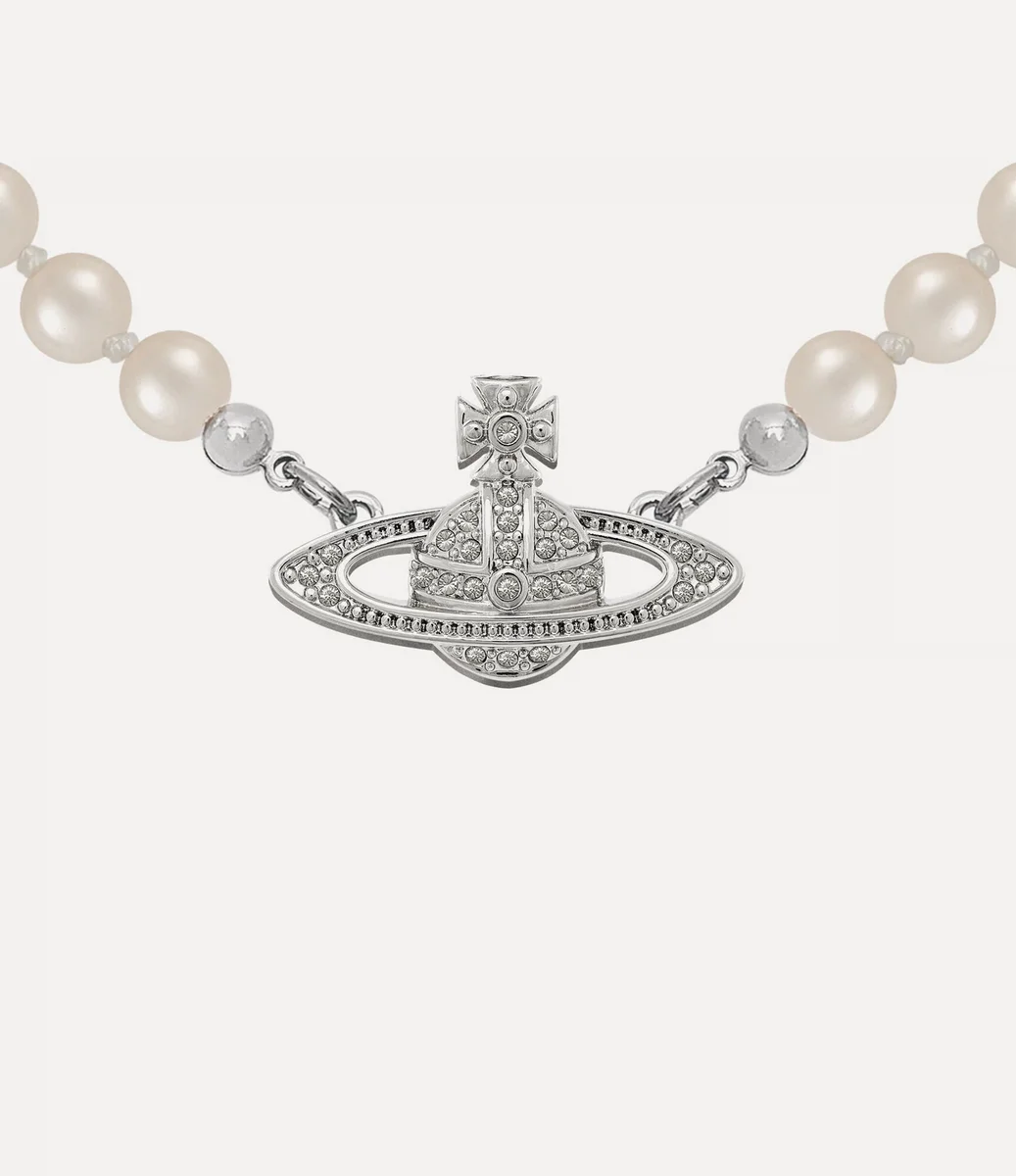 Pod koniec lat 80. Vivienne Westwood zaprezentowała swoją kultową koncepcję pereł podczas pokazu mody Harris Tweed Fall 1987, prezentując naszyjnik z pojedynczym rzędem pereł. Nasz naszyjnik Mini Bas Relief Pearl czerpie inspirację z tego oryginalnego projektu, nadając mu nowy wygląd dzięki klasycznemu motywowi kuli w środkowej części, wzbogaconej błyszczącymi kryształami – nawiązując do etosu marki, łączącego przeszłość z przyszłością.