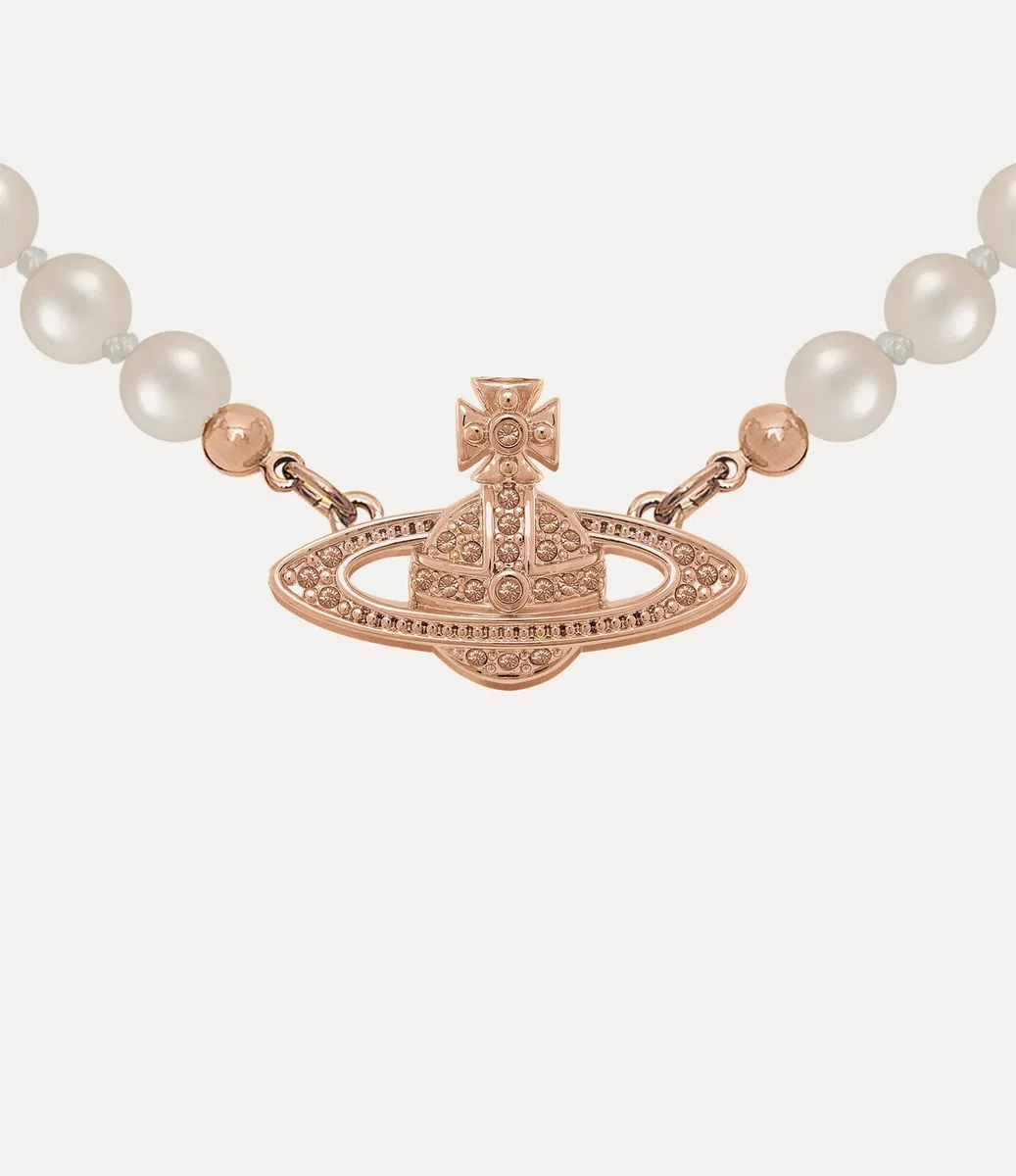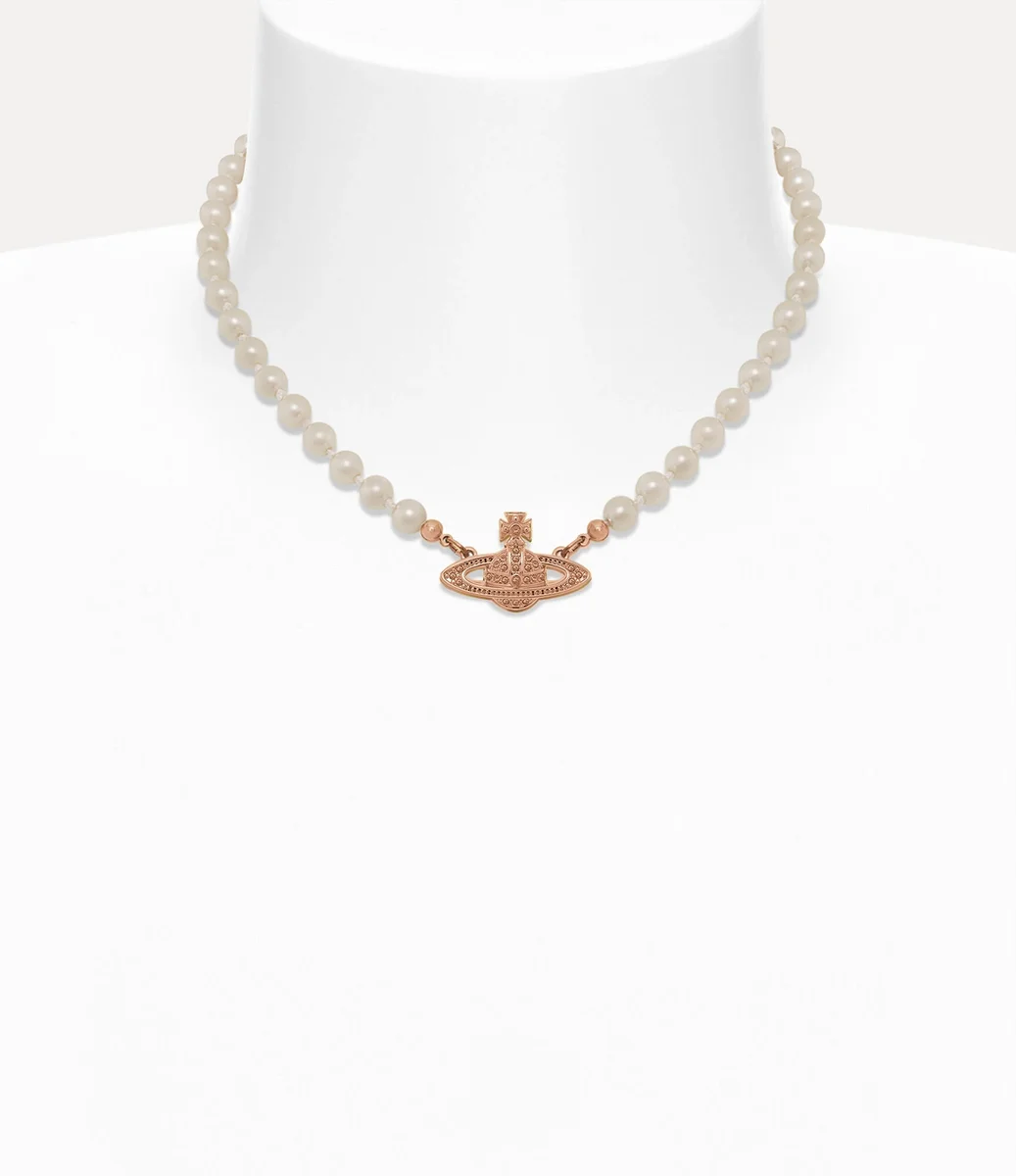 Pod koniec lat 80. Vivienne Westwood zaprezentowała swoją kultową koncepcję pereł podczas pokazu mody Harris Tweed Fall 1987, prezentując naszyjnik z pojedynczym rzędem pereł. Nasz naszyjnik Mini Bas Relief Pearl czerpie inspirację z tego oryginalnego projektu, nadając mu nowy wymiar dzięki klasycznemu motywowi kuli w środkowej części, wzbogaconej błyszczącymi kryształami – nawiązując do etosu domu mody, łączącego przeszłość z przyszłością.