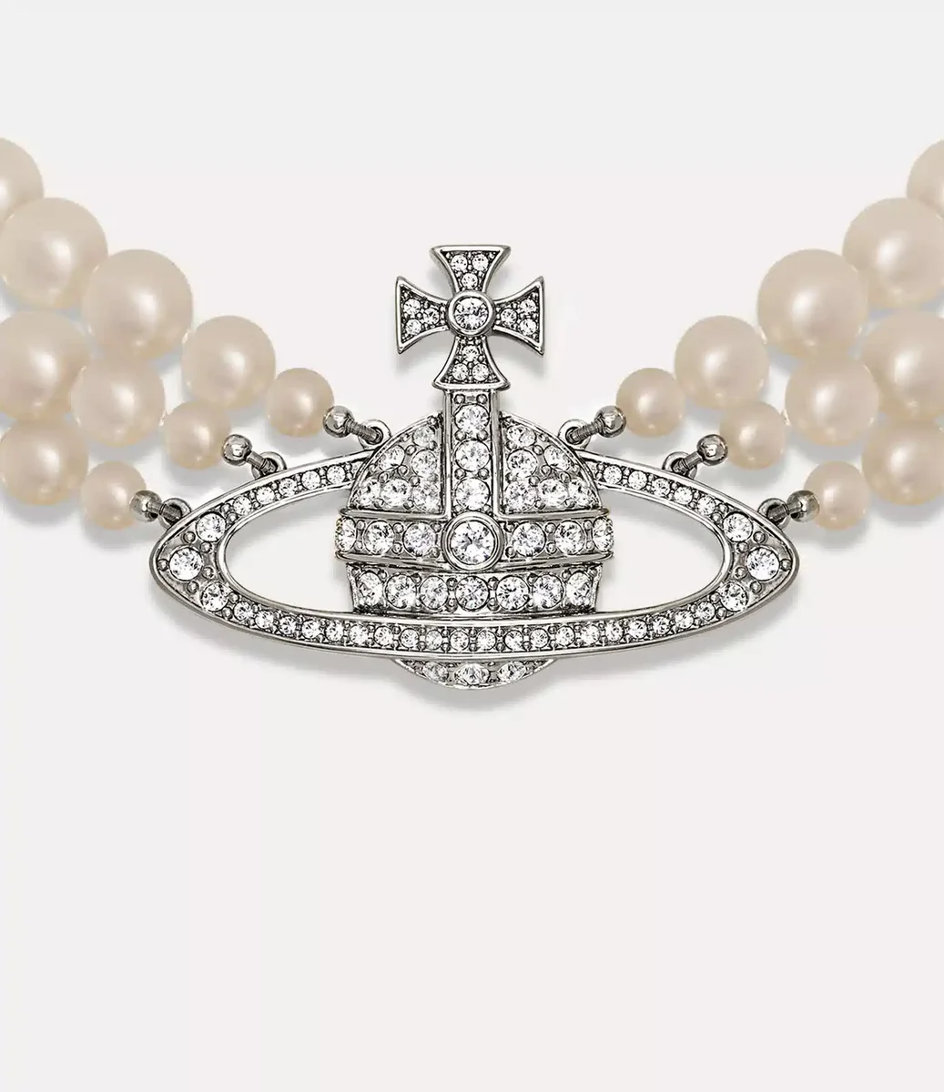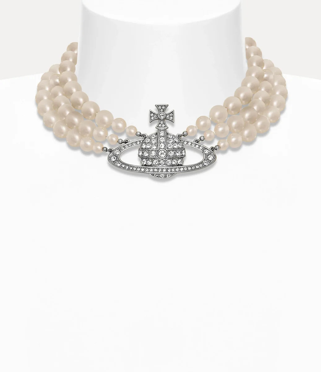 Naszyjnik z trzema rzędami pereł w płaskorzeźbie, który po raz pierwszy pojawił się w naszej kultowej kolekcji „Portrait” z 1990 roku, czerpie inspirację z klasycznej biżuterii z pereł, łącząc charakterystyczne dla Vivienne podejście polegające na połączeniu estetyki punkowej z wpływami historycznymi. Projekt charakteryzuje się centralną kulą w płaskorzeźbie ozdobioną białymi kryształami, uosabiającą wizję domu mody, polegającą na przeniesieniu przeszłości w przyszłość.