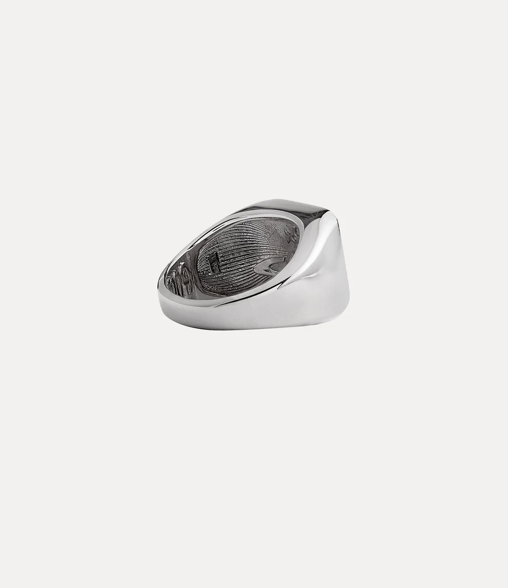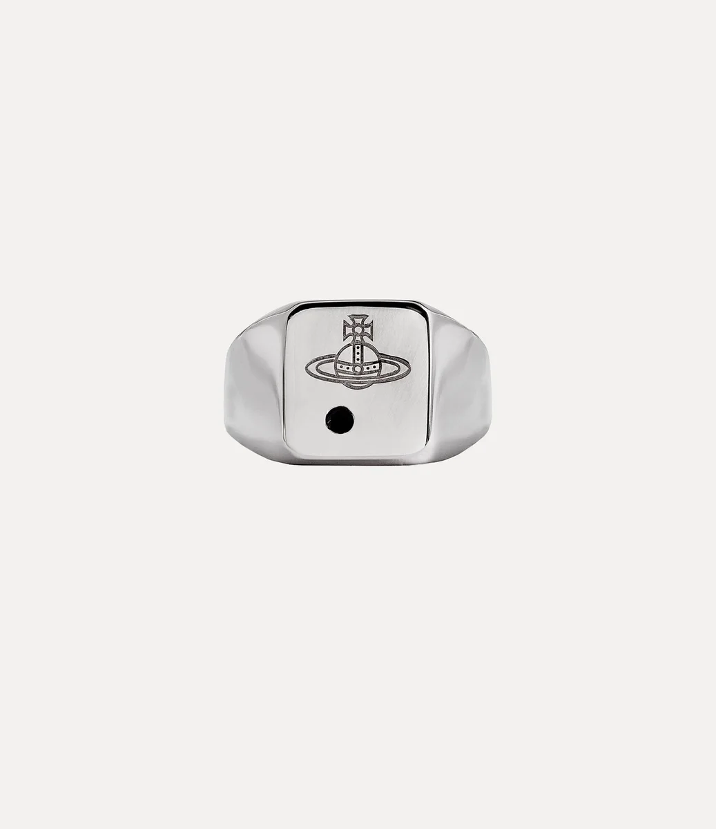 Nasz pierścionek Carlo ma ponadczasowy kształt sygnetu i jest wykończony srebrem w kolorze platyny. Kwadratowa powierzchnia jest ozdobiona czarnym kryształem, uzupełnionym grawerowanym motywem kuli symbolizującym tradycję i otoczonym niebiańskimi pierścieniami Saturna, reprezentującymi przyszłość.