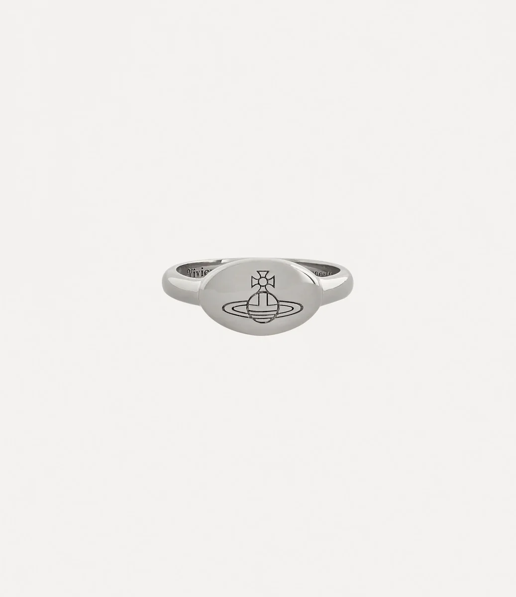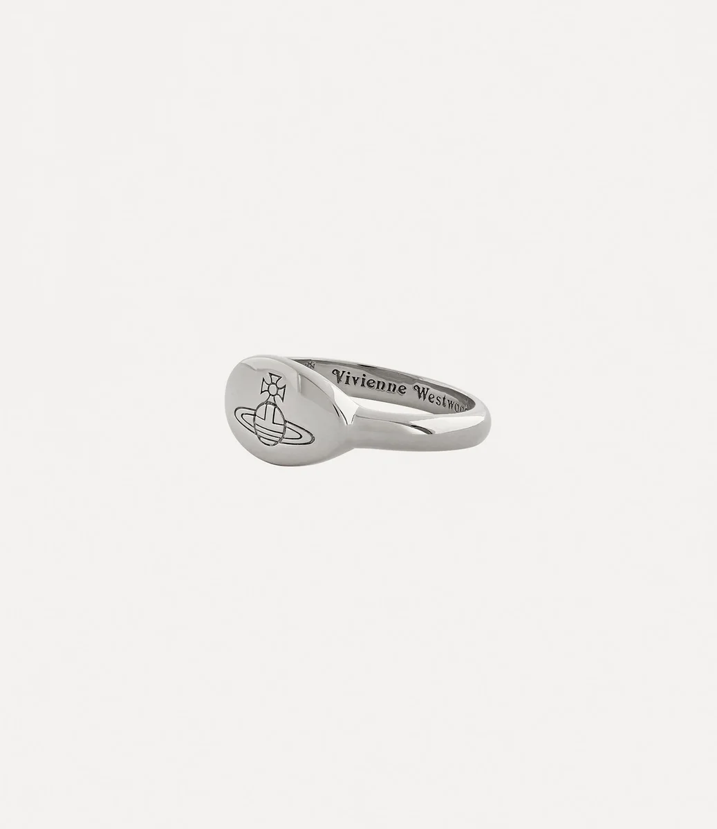 Pierścionek Vivienne Westwood Tilly ma klasyczny kształt sygnetu, jest wykonany z srebra pochodzącego z recyklingu i wykończony polerowaną platynową powłoką.