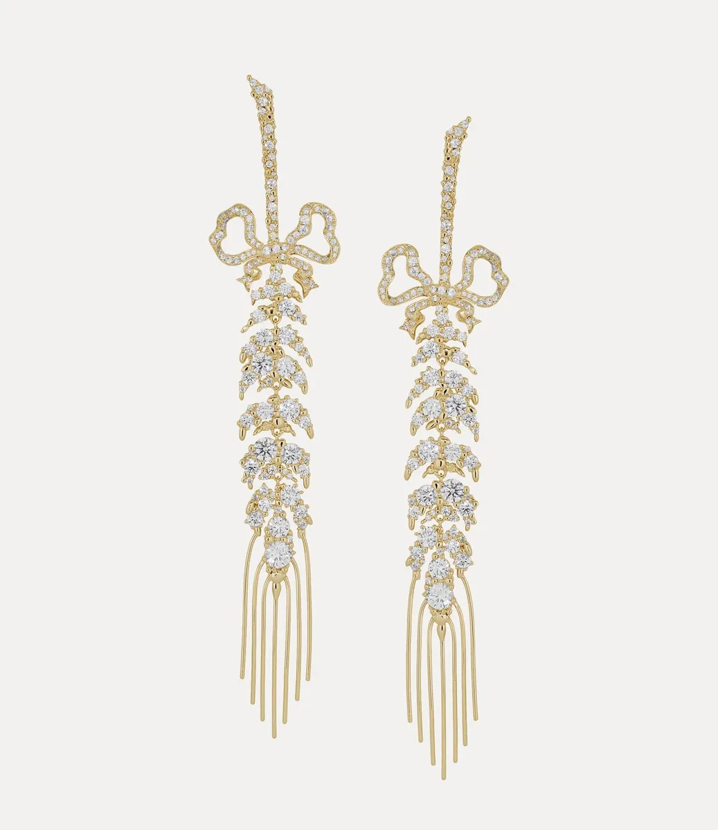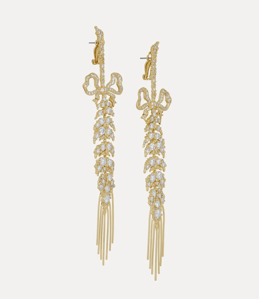 Kolczyki Chloris czerpią inspirację z mitologii greckiej i charakteryzują się skomplikowaną kroplową sylwetką skupioną wokół delikatnego motywu pszenicy – ponadczasowego symbolu dobrobytu, płodności i obfitości. Projekt, nawiązujący do charakterystycznego dla marki kształtu kokardki, przypominającego biżuterię georgiańską, zdobią błyszczące kryształy w oprawie pavé.