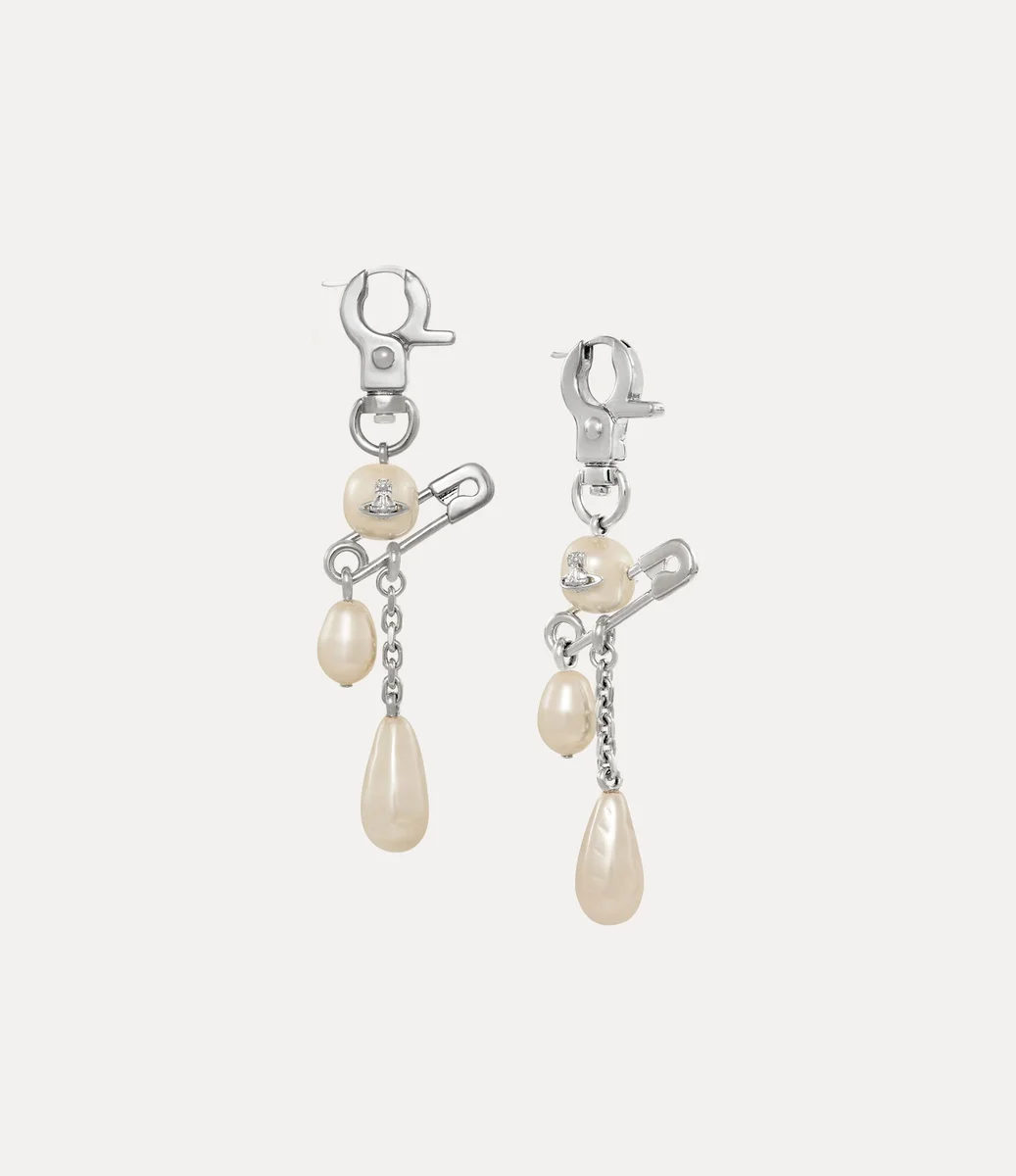 Srebrne kolczyki Claude Long mają w środku wzoru perłę ozdobioną kulką, przebitą agrafką – nawiązującą do punkowej estetyki Vivienne. Kolczyki mają kształt kropli, są wyposażone w zapięcie inspirowane elementami metalowymi i bezpieczny trzpień na zawiasie.