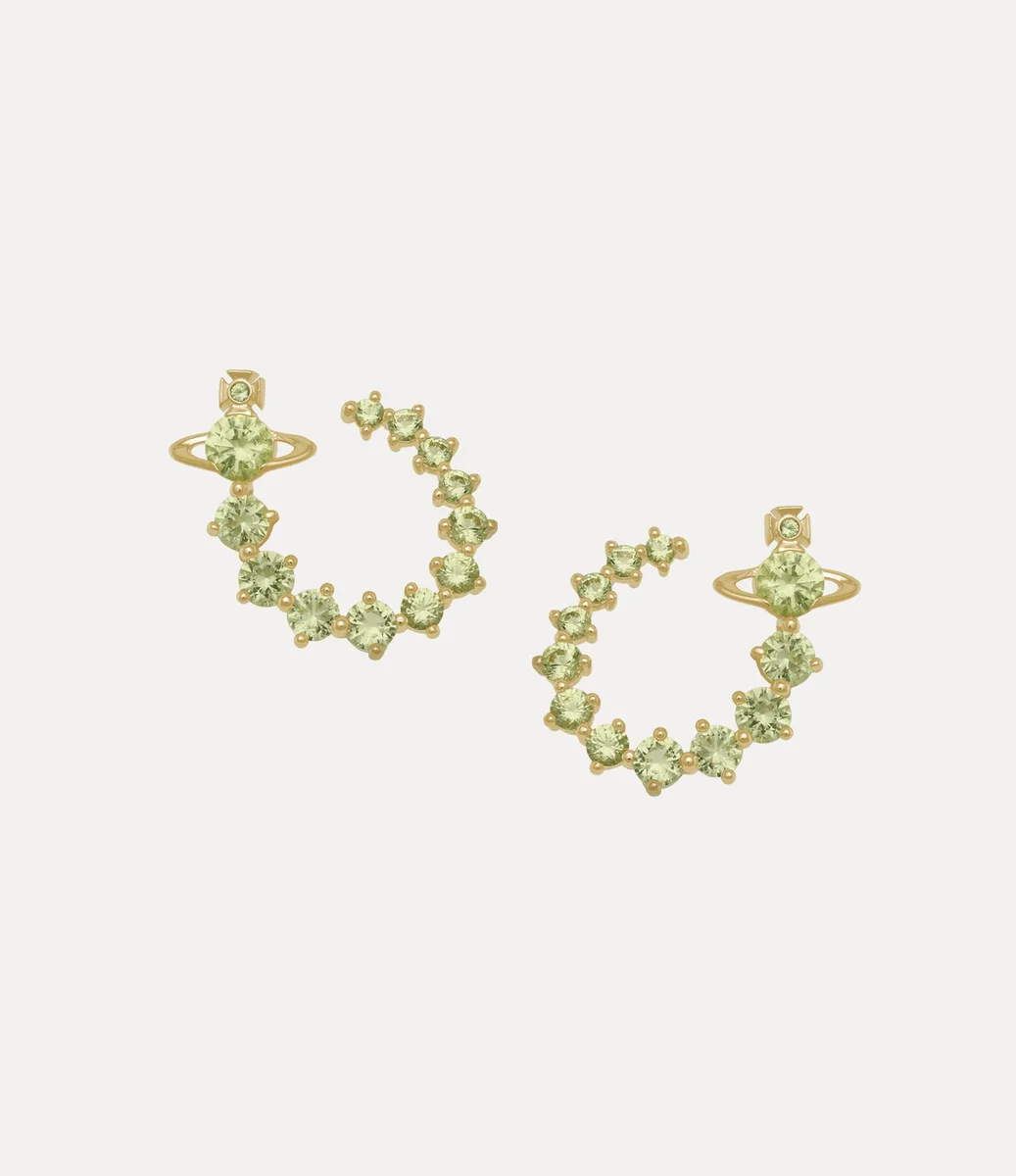 Nasze kolczyki Lydia, wykonane z polerowanego złota, delikatnie opadają wokół płatka ucha, tworząc iluzję rzeźbionej obręczy. Ozdobione cyrkoniami o eleganckim, zwężającym się kształcie, kolczyki zdobi nasze ponadczasowe logo w kształcie kuli, nawiązujące do wizji Vivienne, która przenosi tradycję w przyszłość.