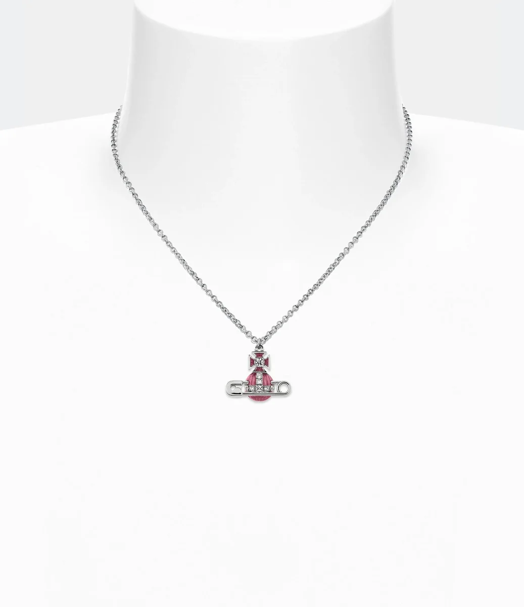 Nasza naszyjnik Kitty Pendant zawiera nasz klasyczny emblemat w kształcie kuli, ręcznie pomalowany półprzezroczystą emalią w kolorze różowym, aby odsłonić skomplikowany metalowy wzór pod spodem. Element ten ma srebrne wykończenie, uzupełnione motywem agrafki, symbolem nonkonformizmu, przypominającym charakterystyczne punkowe podejście Vivienne.
