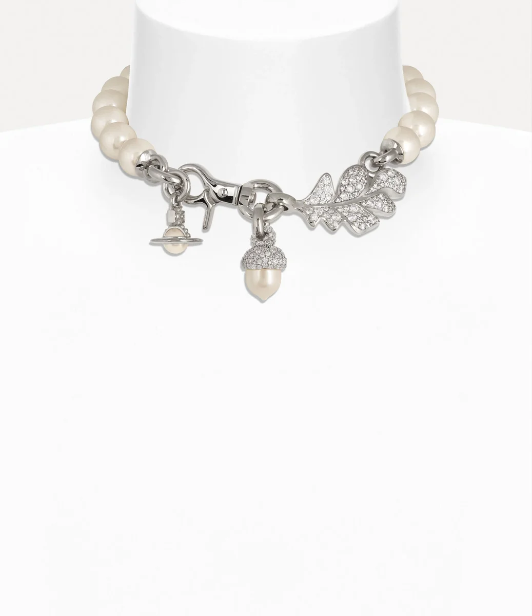 Naszyjnik Lucille Large zdobi rząd dużych pereł ze szkła Swarovskiego, ozdobionych charakterystycznymi dla marki motywami żołędzi i liści. Naszyjnik jest wzbogacony o zdobienia w stylu pavé i zakończony obrotowym zapięciem typu karabińczyk, z którego elegancko zwisa wisząca kula.