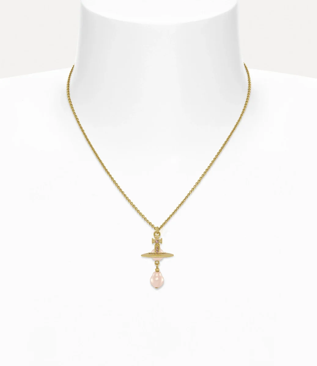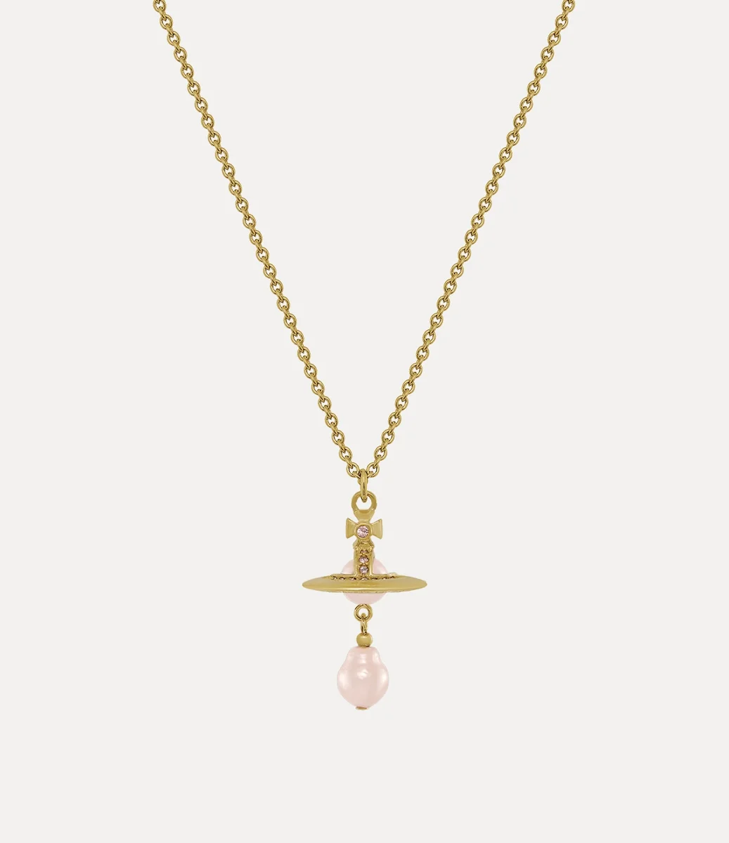 Naszyjnik z wisiorem Aleksa ożywia klasyczny trójwymiarowy motyw kuli, uosabiając etos przenoszenia przeszłości w przyszłość. Wisior jest ozdobiony błyszczącymi kryształami i opada w barokowy detal z perły na szklanej podstawie, wykończony polerowaną powłoką w kolorze złotym.