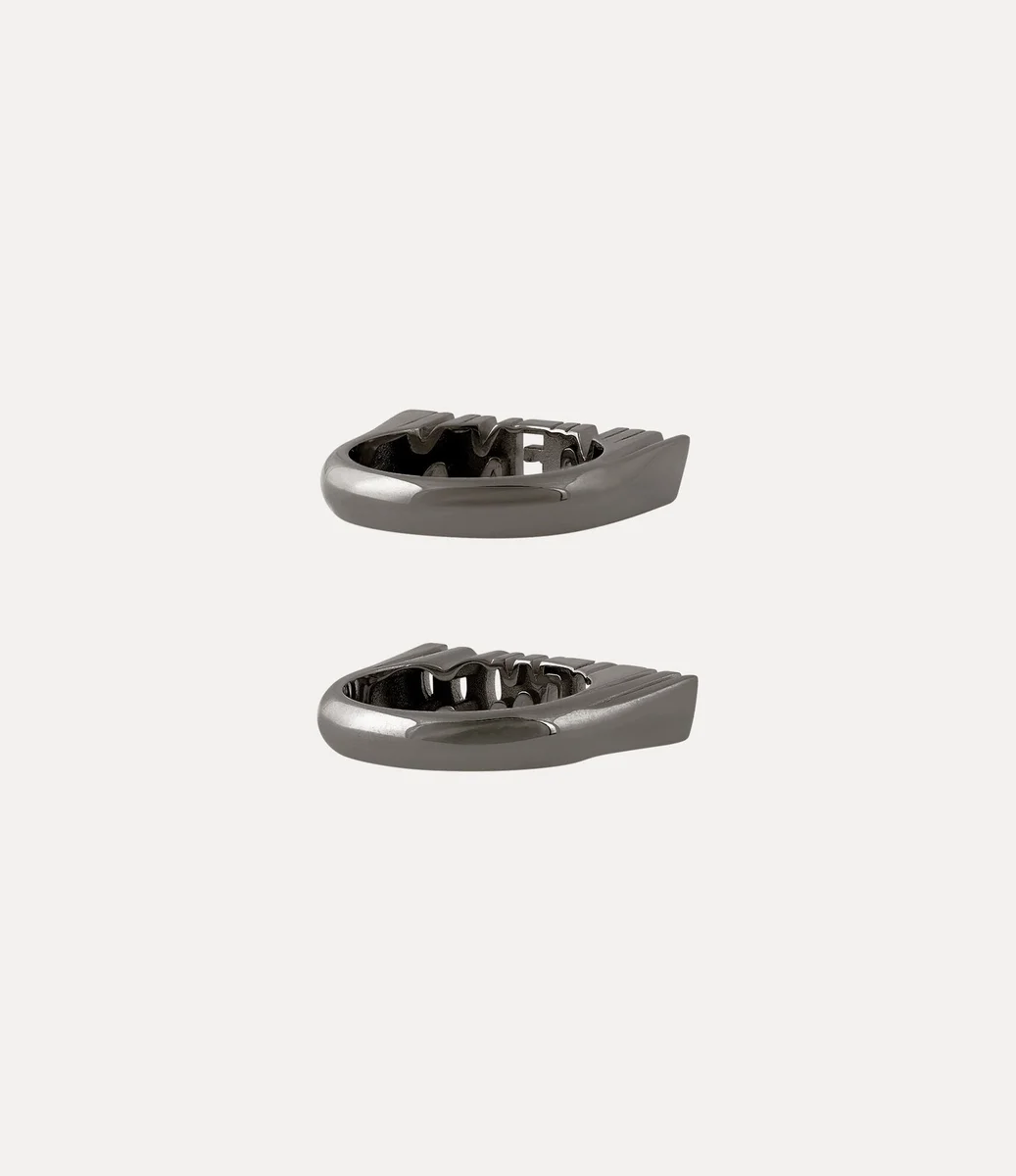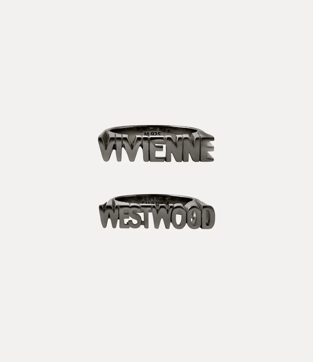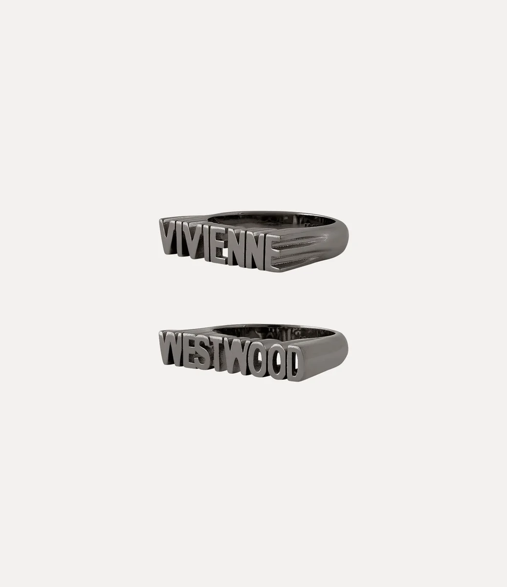 Nasz pierścionek Essex jest wykonany z srebra pochodzącego z recyklingu i wykończony polerowaną powłoką w kolorze brązu. Składa się z dwóch wyrazistych, całkowicie metalowych opasek, z których jedna zawiera napis „Vivienne”, a druga „Westwood”. Projekt jest podkreślony misternymi wycięciami, które podkreślają kontury każdej litery.