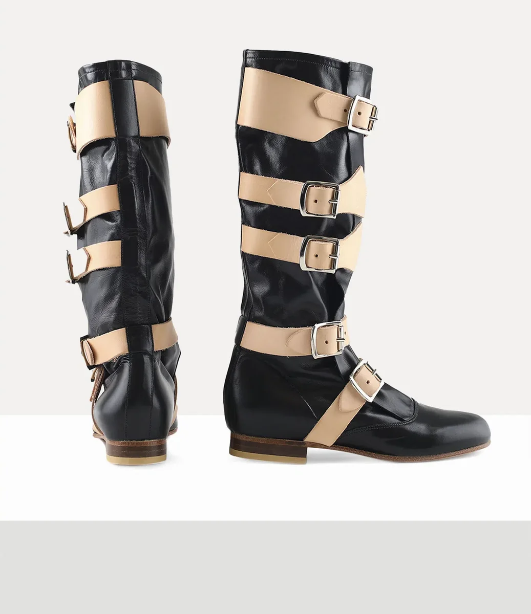 Nasze buty Pirate po raz pierwszy pojawiły się w kolekcji „Pirate” na sezon jesień-zima 1981 r., która została zainspirowana zainteresowaniem Vivienne przygodowymi opowieściami o piratach z XVII i XVIII wieku. Projekt oddaje romantyczną i buntowniczą naturę piratów dzięki owiniętej, miękkiej, luźnej cholewce i grubym skórzanym paskom z klamrami, które nadają butom surowy, postarzany wygląd.