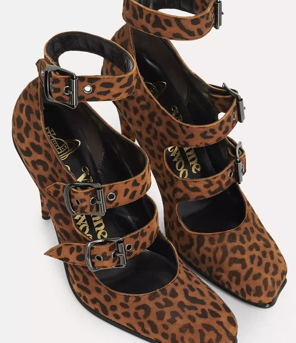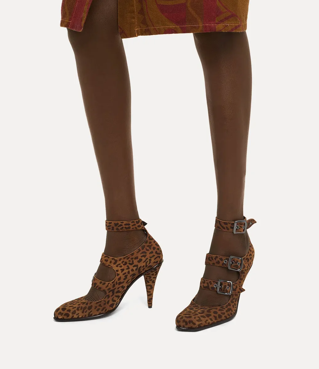 Nasze szpilki Savage mają anatomiczny kształt inspirowany charakterystycznym motywem „Animal Toe” marki, wprowadzonym po raz pierwszy w kolekcji wiosna–lato 2000 „Summertime”. Wykonane ze skóry, mają nadruk w stylu vintage z motywem lamparta i wykończone metalowymi elementami w kolorze brązu.