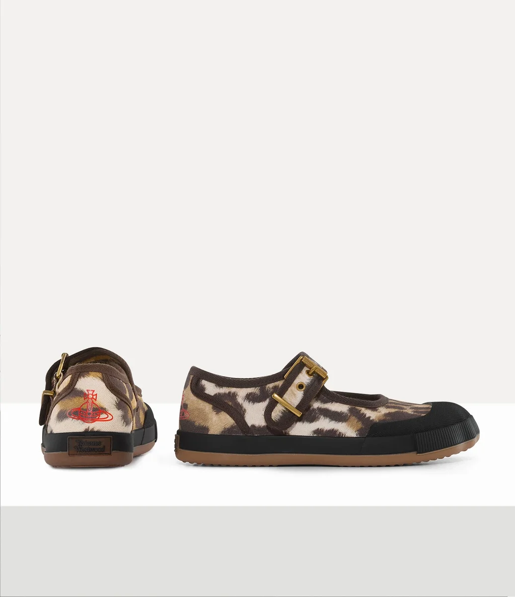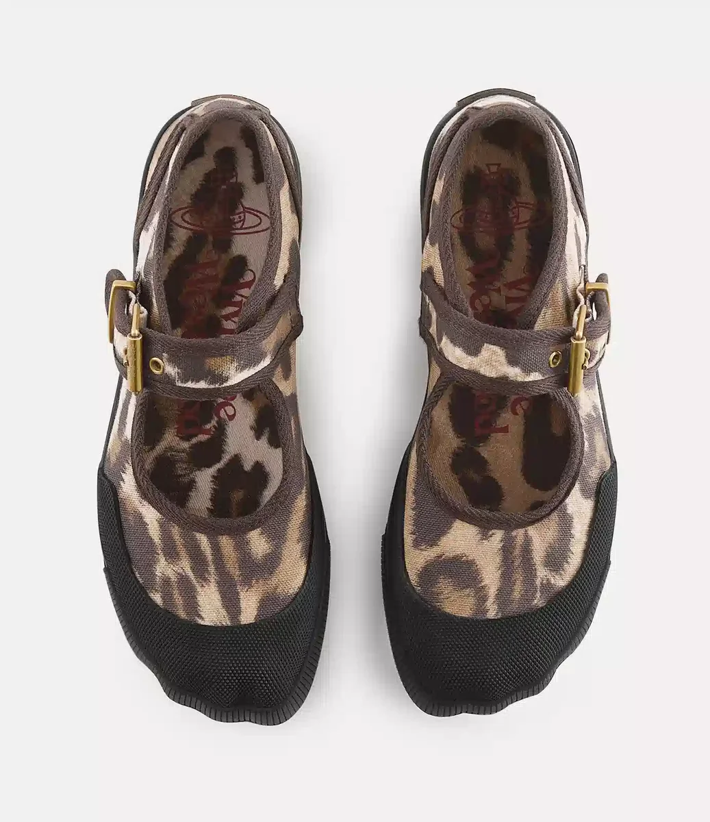 Buty Vivienne Westwood Animal Gym Bar zostały w tym sezonie przeprojektowane i pokryte nadrukiem w panterkę, a ich charakterystycznym elementem jest kultowa kula na pięcie.