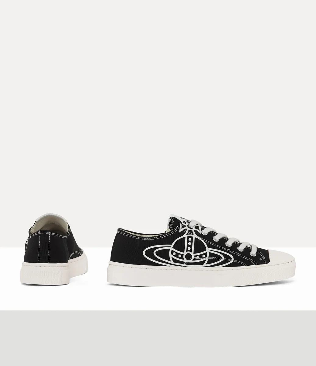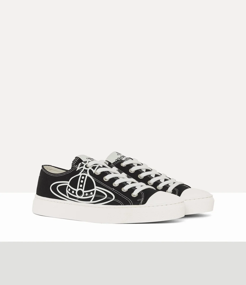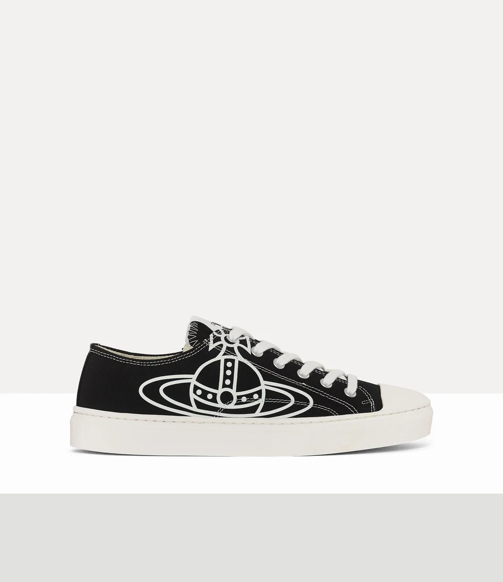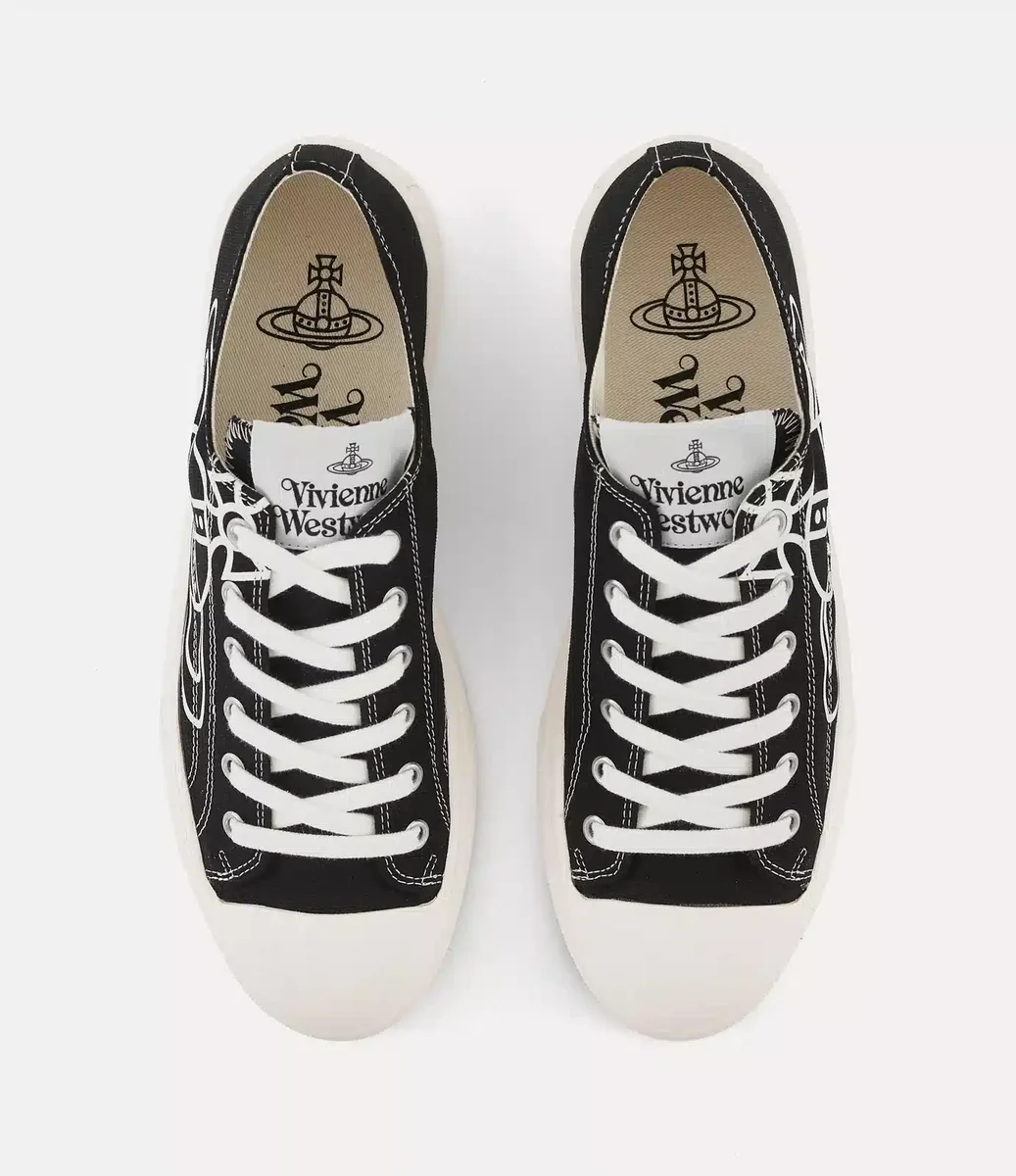 Nasze niskie płócienne trampki mają na całej powierzchni archiwalny motyw „Line Orb” – symbolizujący wizję Vivienne, która chce przenieść tradycję w przyszłość. Model ma wykończenie z bawełnianego płótna i tkaną metkę na języku.