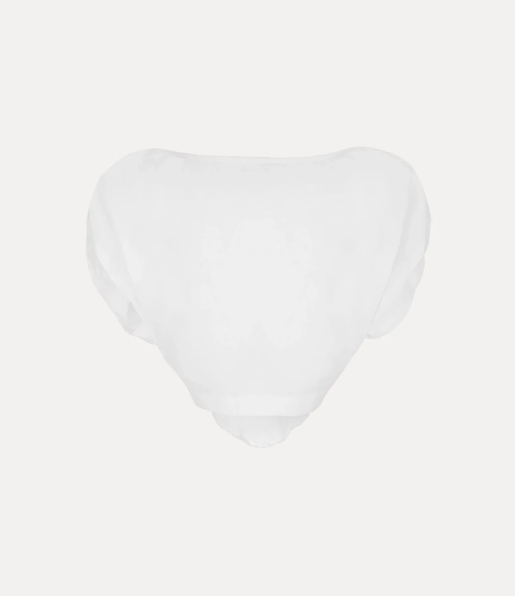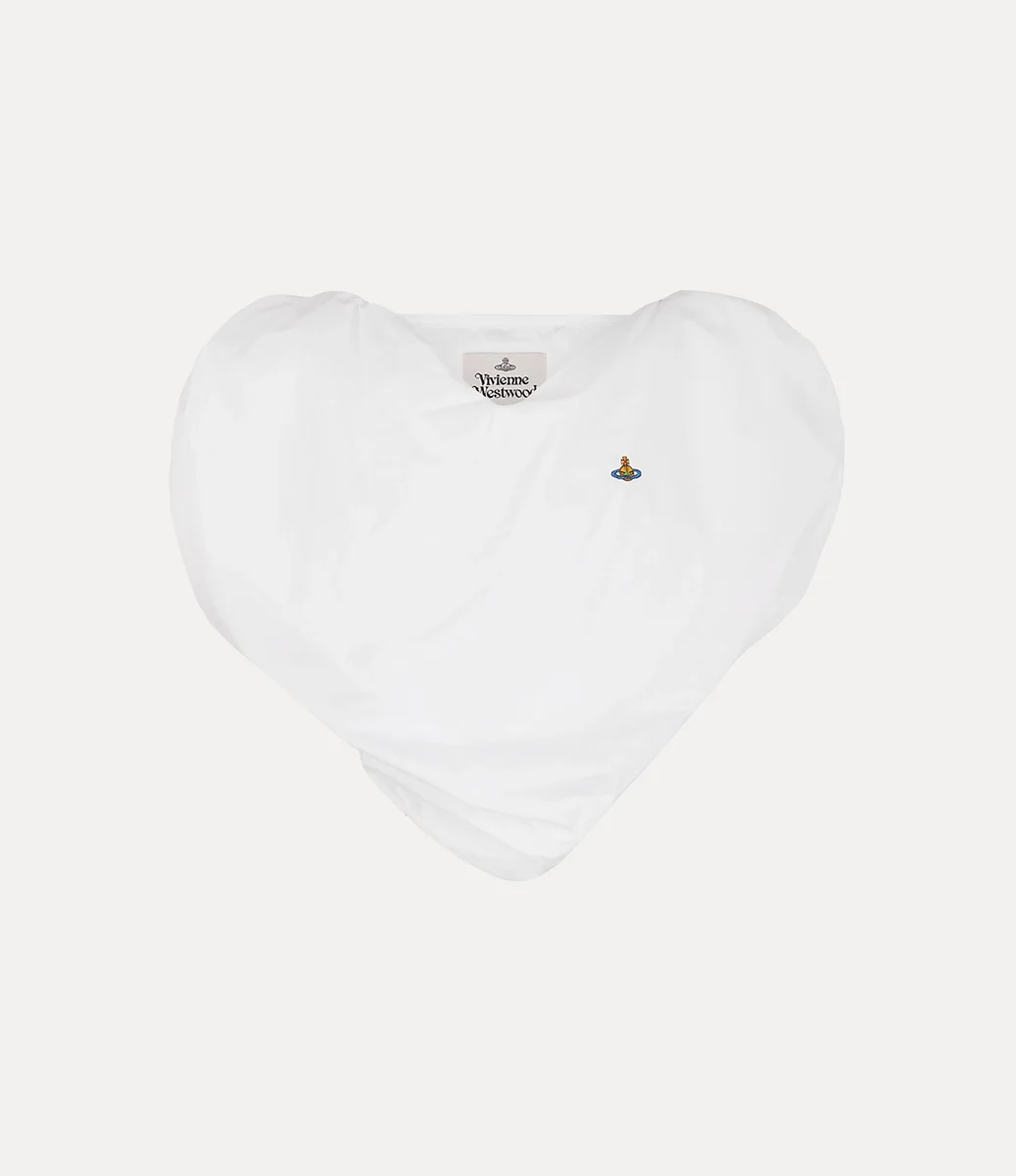 Asymetryczny kształt serca stał się charakterystycznym elementem stylu marki, pojawiającym się w wielu kolekcjach w całej naszej historii. Top Heart z bieżącego sezonu przywraca tę sylwetkę, którą Vivienne wykorzystywała, aby wyrazić miłość zarówno do ludzkości, jak i do planety, uzupełniając ją haftowanym symbolem kuli po lewej stronie projektu.