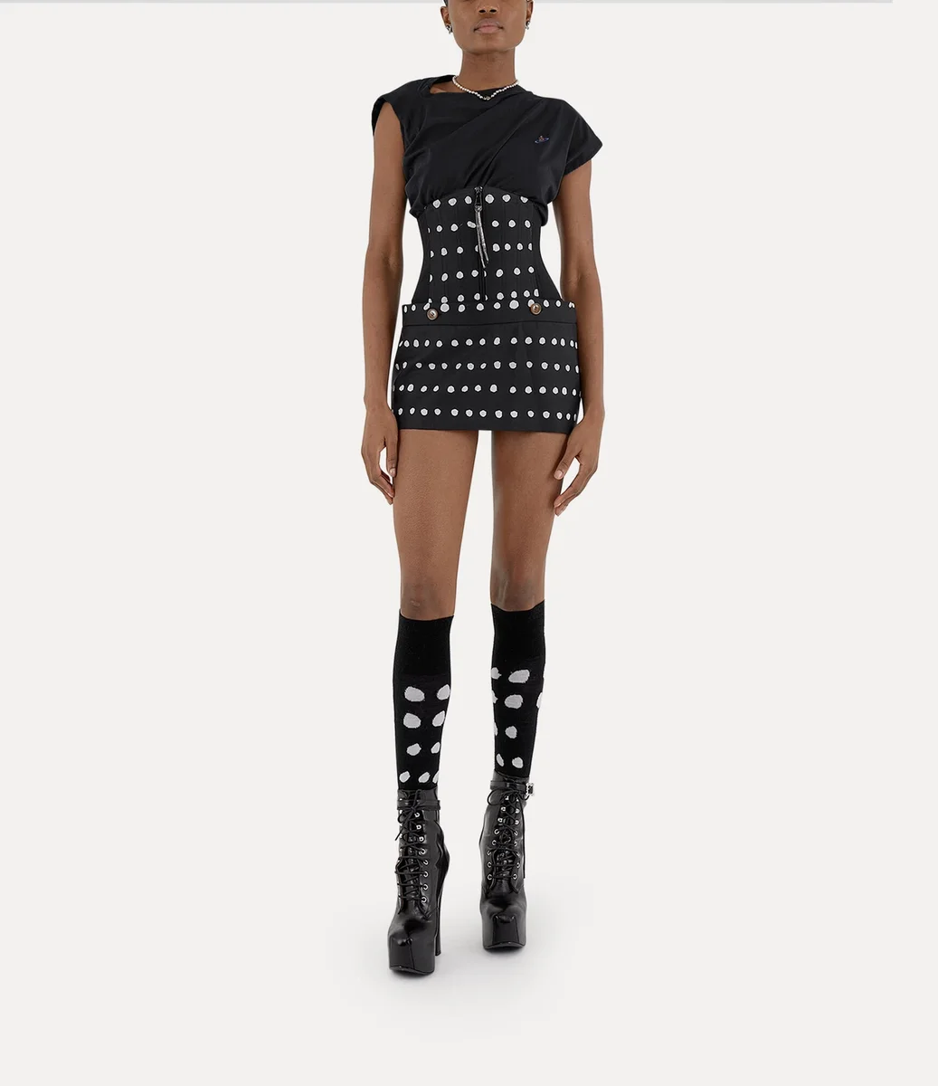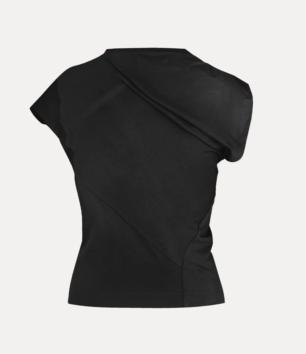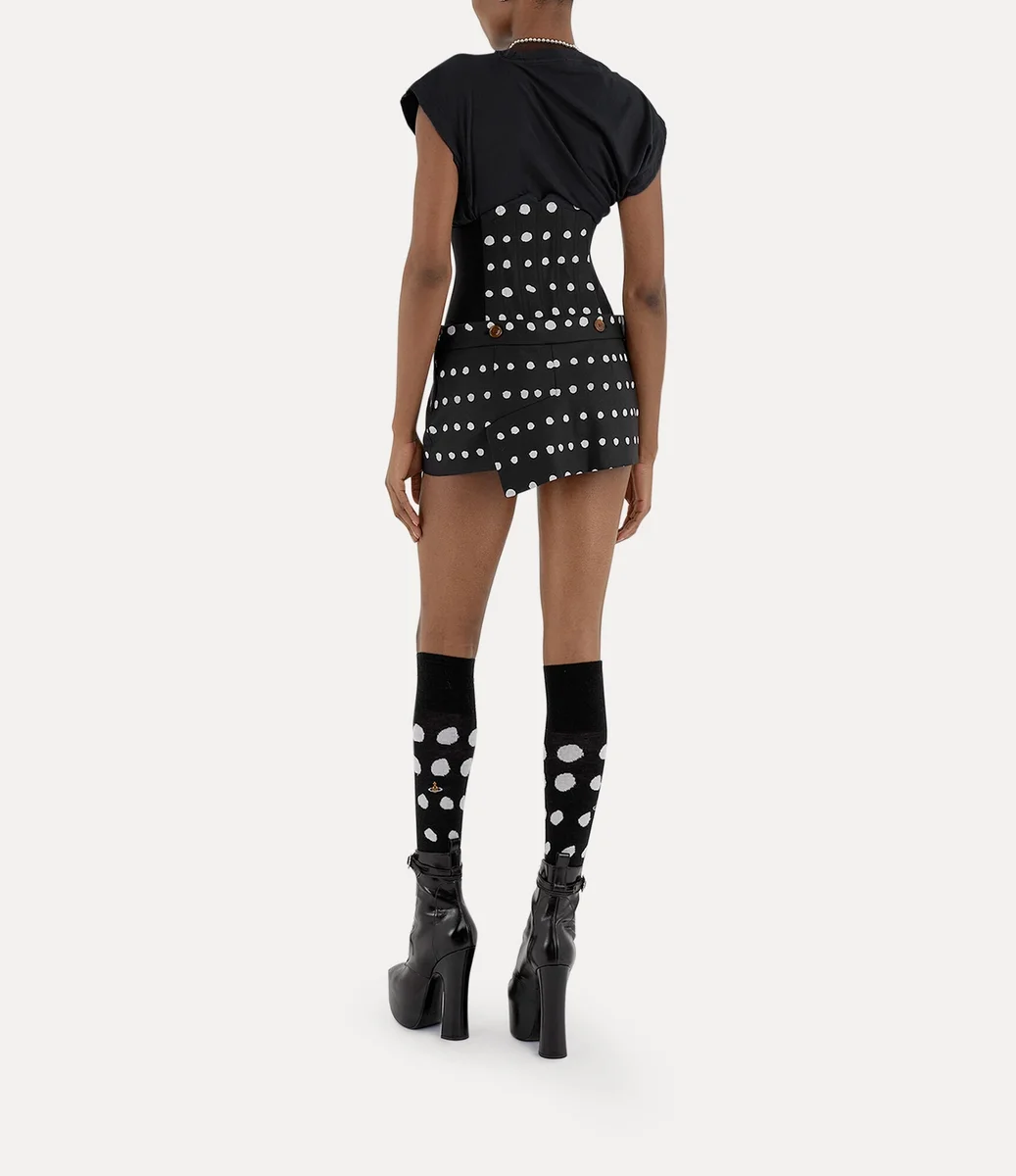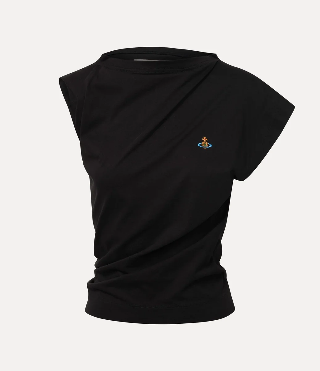 Charakterystyczny dla marki top Hebo został zaktualizowany i w tym sezonie ma miękkie bawełniane wykończenie oraz haft w kształcie kuli po lewej stronie klatki piersiowej – symbolizujący wizję Vivienne dotyczącą przeniesienia tradycji w przyszłość. Sylwetka zawiera charakterystyczny dla Vivienne dekolt inspirowany cięciem, drapowane detale i skręcony materiał z tyłu.