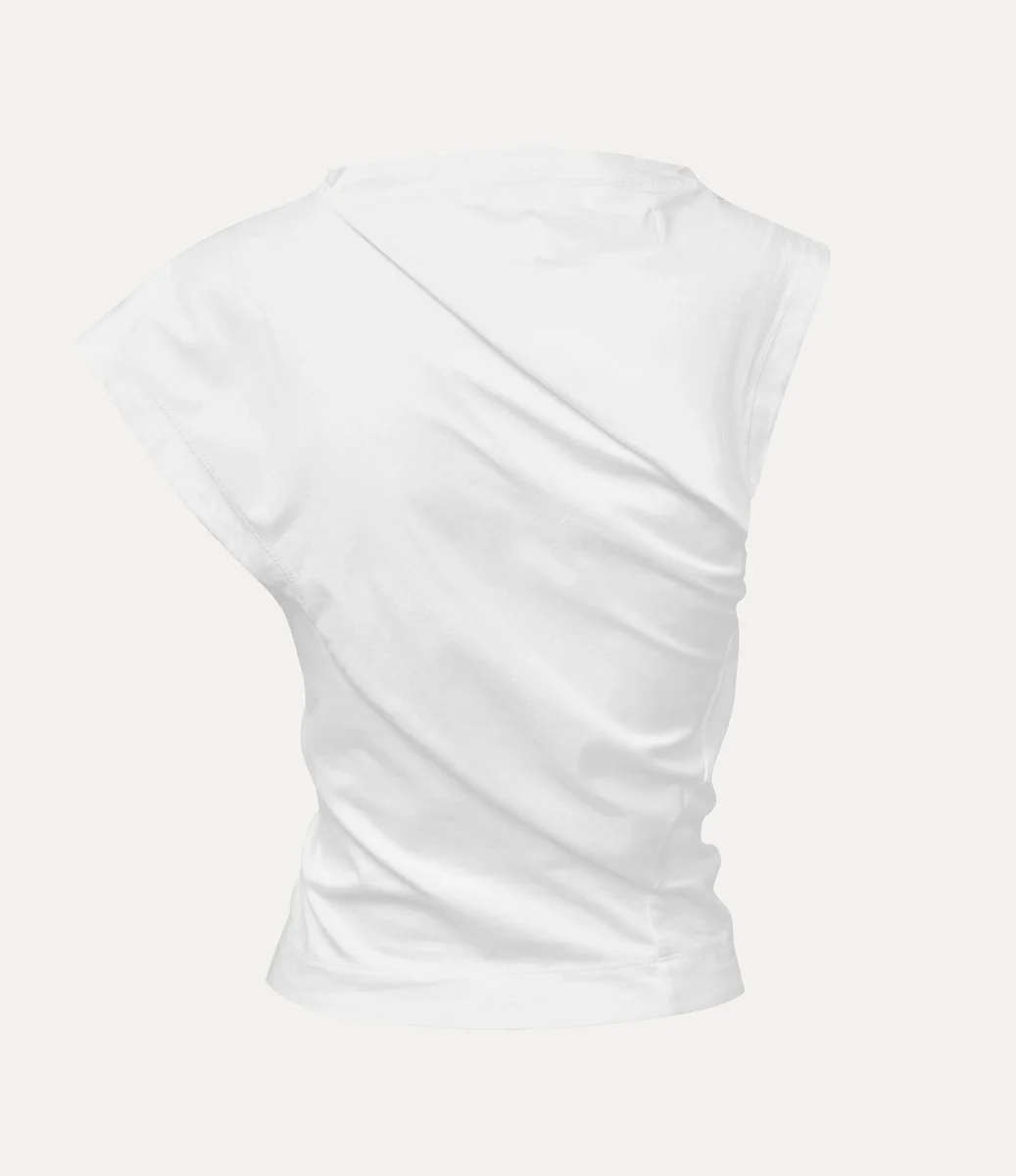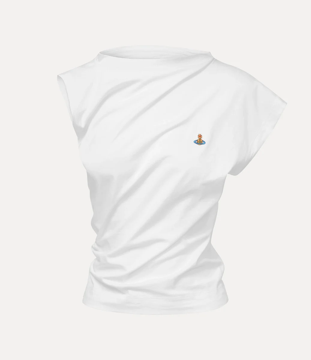 Charakterystyczny dla marki top Hebo został zaktualizowany i w tym sezonie ma miękkie bawełniane wykończenie oraz haft w kształcie kuli po lewej stronie klatki piersiowej – symbolizujący wizję Vivienne dotyczącą przeniesienia tradycji w przyszłość. Sylwetka zawiera charakterystyczny dla Vivienne dekolt inspirowany cięciem, drapowane detale i skręcony materiał z tyłu.