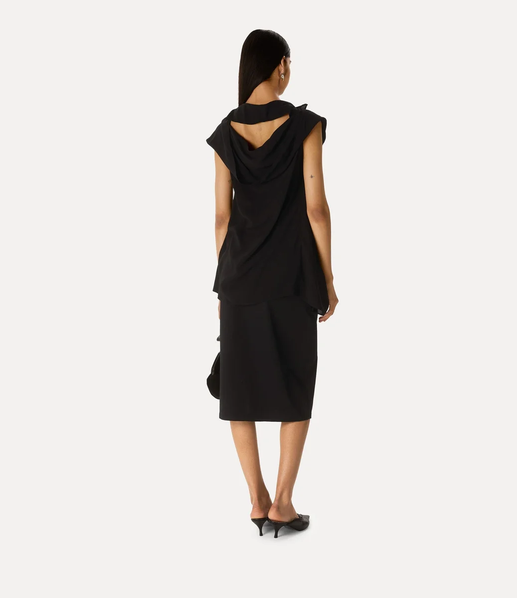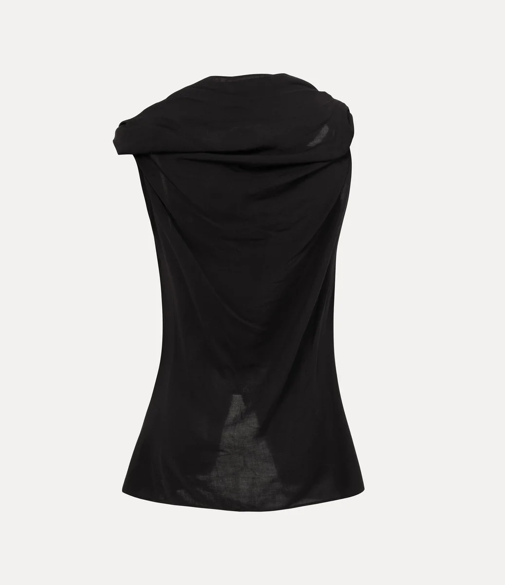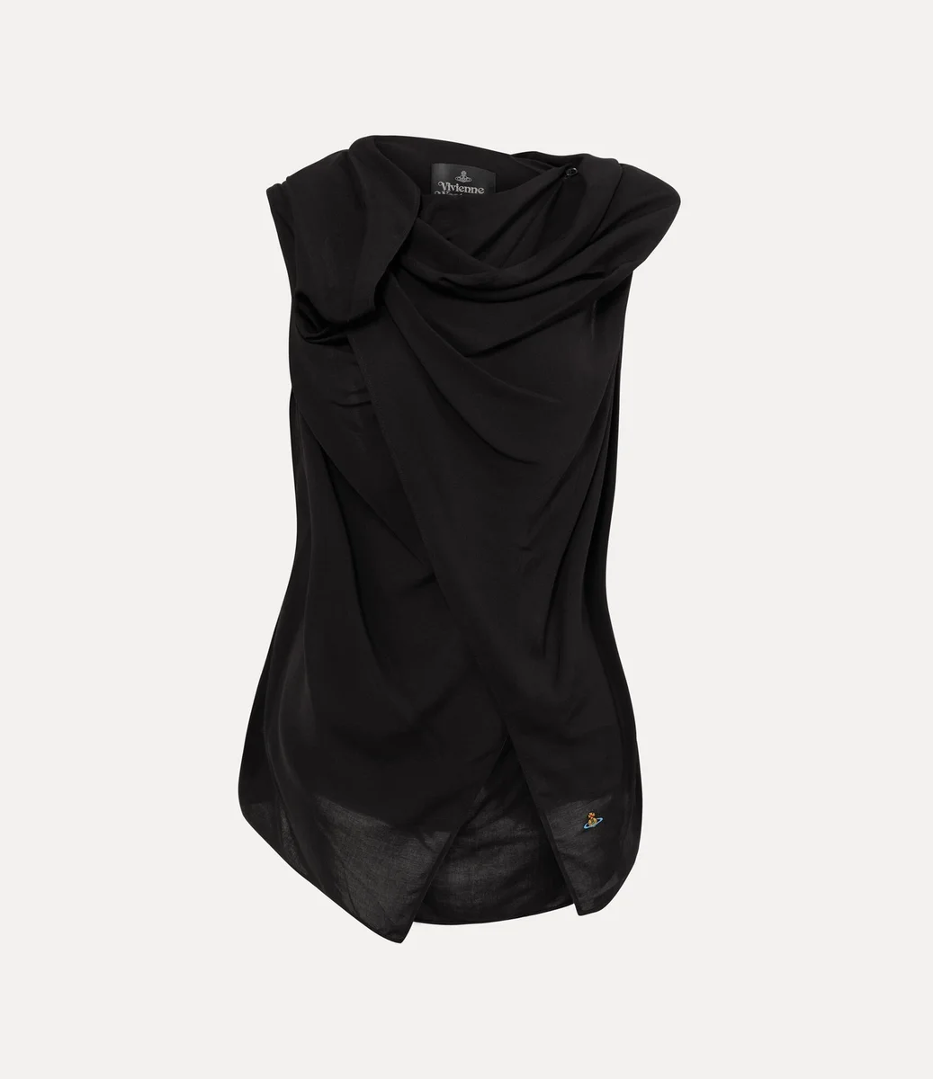 Nasza bluzka Cross Over ma wydłużony krój, który delikatnie opada na sylwetkę. Jest to model bez rękawów, z asymetrycznym kopertowym dekoltem i miękko marszczonym dekoltem w kształcie kaptura, który otacza szyję.