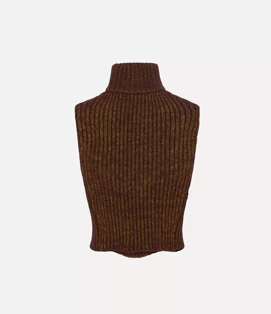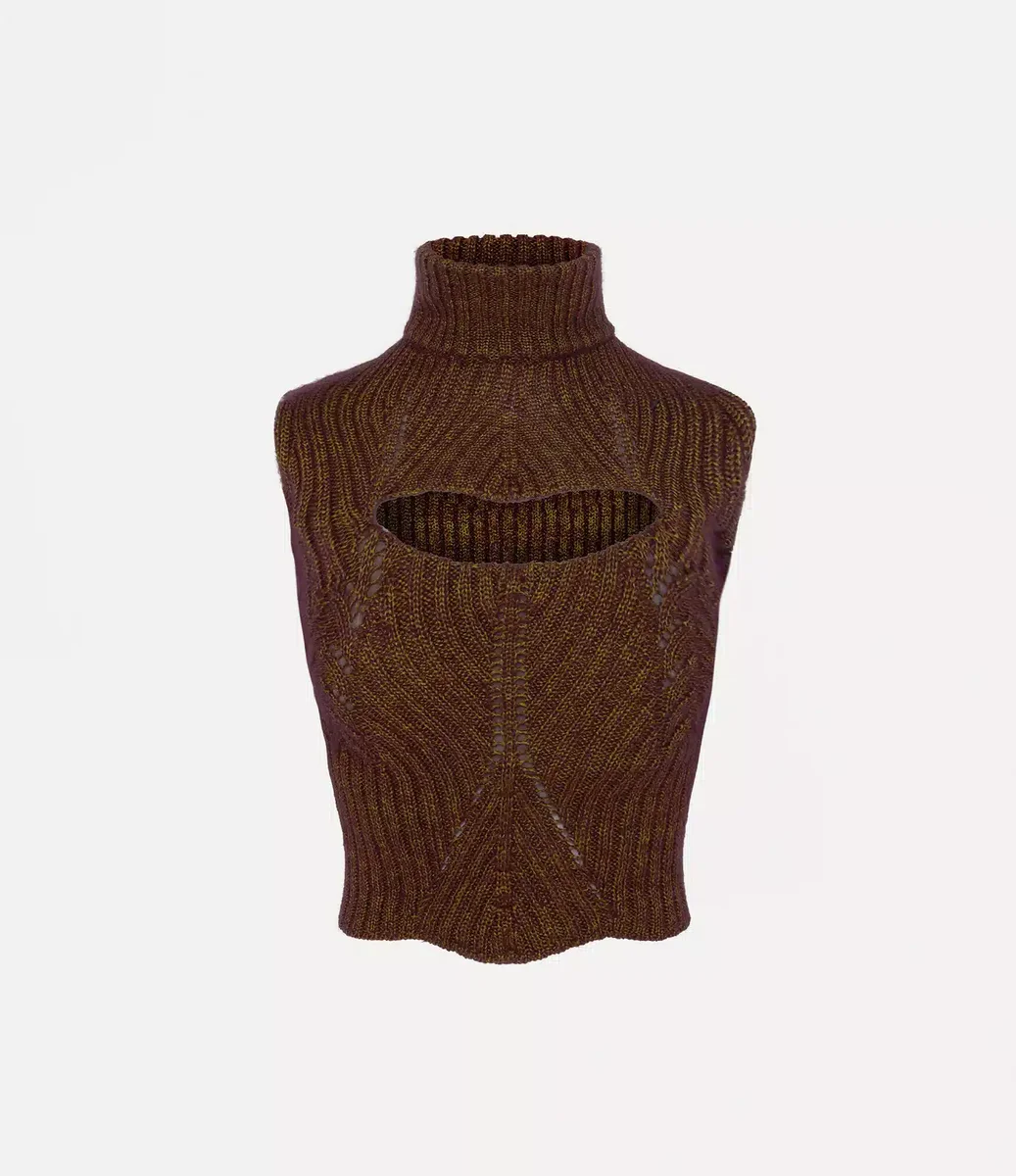 Bezrękawowy top Mary Corset jest wykonany z mieszanki jedwabiu i moheru, łączącej ścieg jodełkowy i ściągaczowy. Top ma poziome rozcięcie nad klatką piersiową, a pod warstwą dzianiny znajduje się biustonosz w stylu gorsetu, który zapewnia wsparcie. Całość dopełniają ściągaczowe wykończenia wzdłuż wysokiego dekoltu i na całej powierzchni.