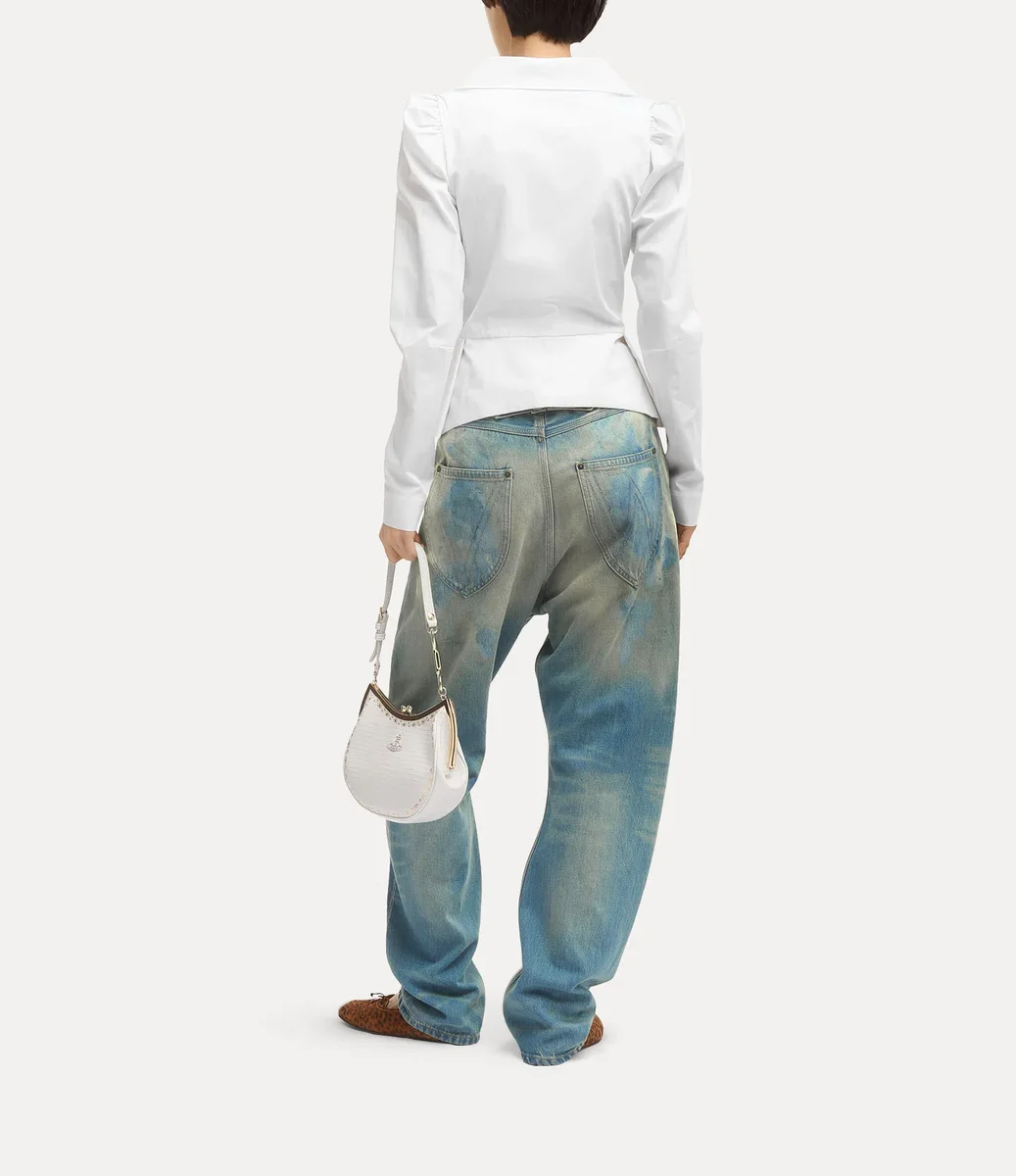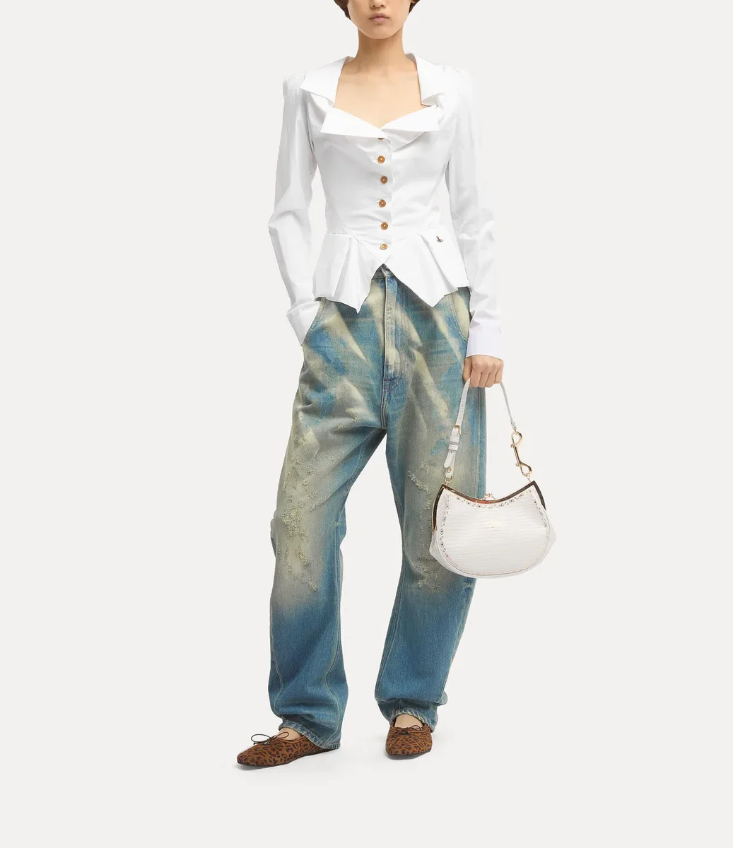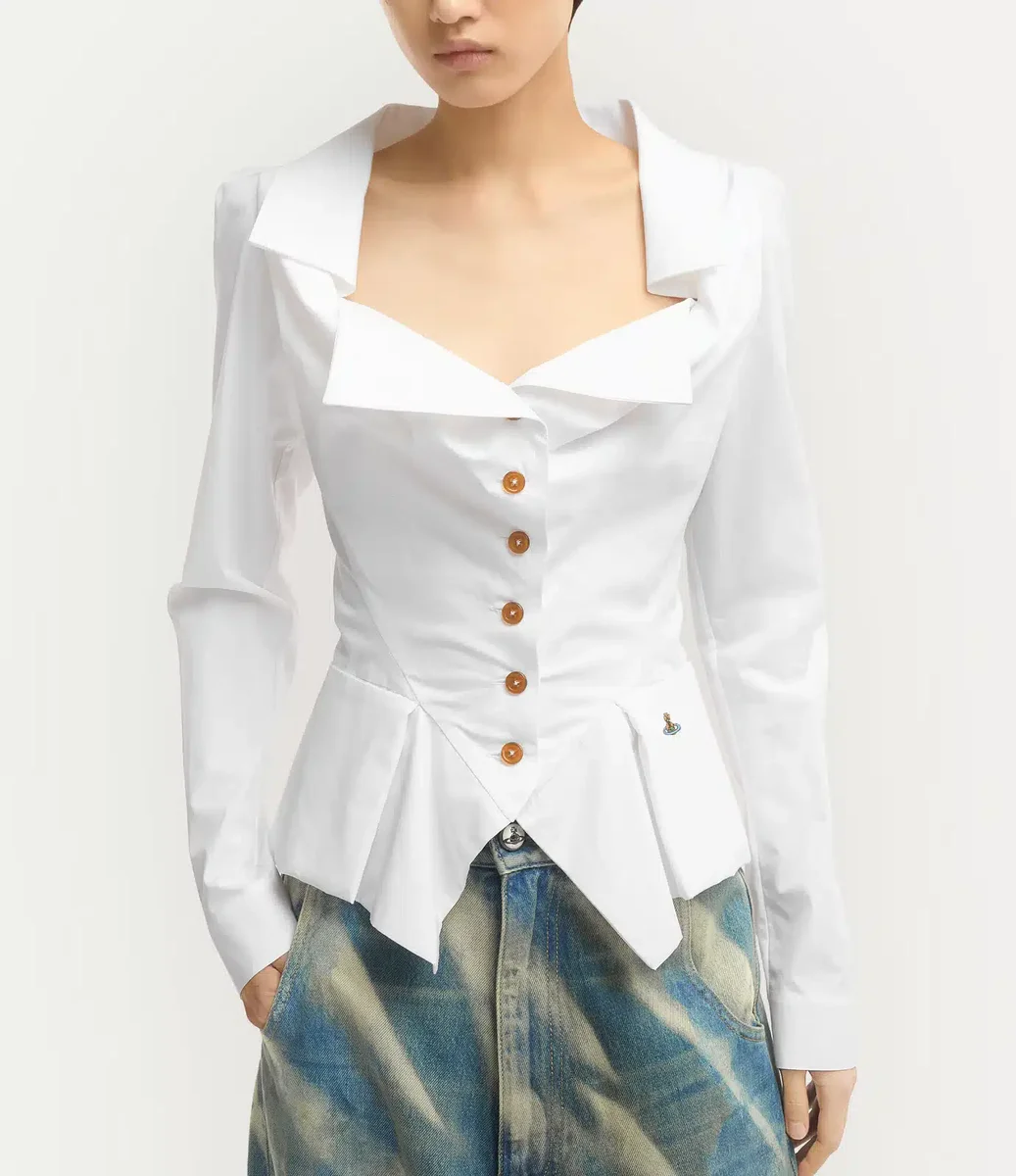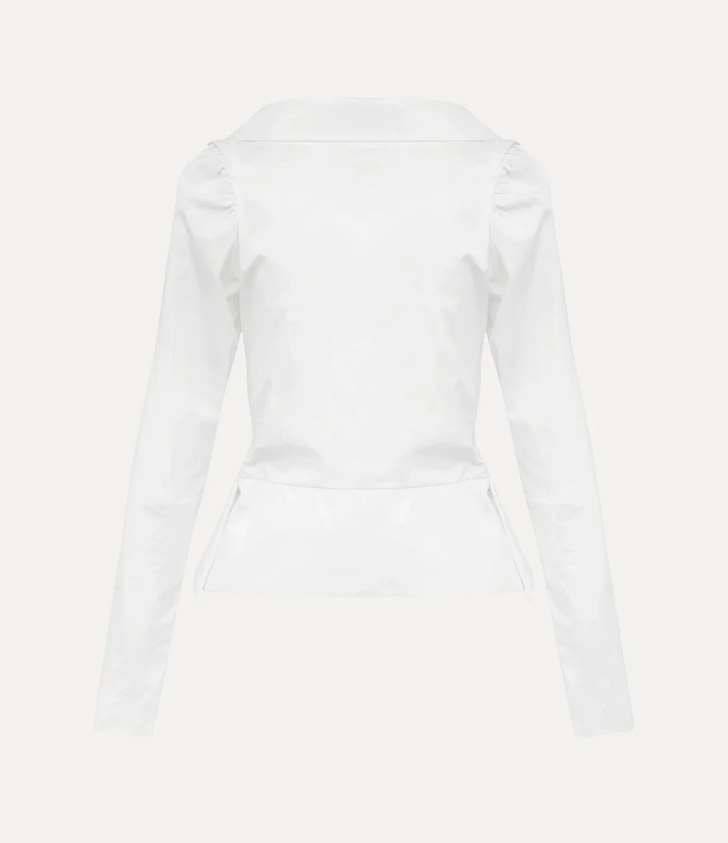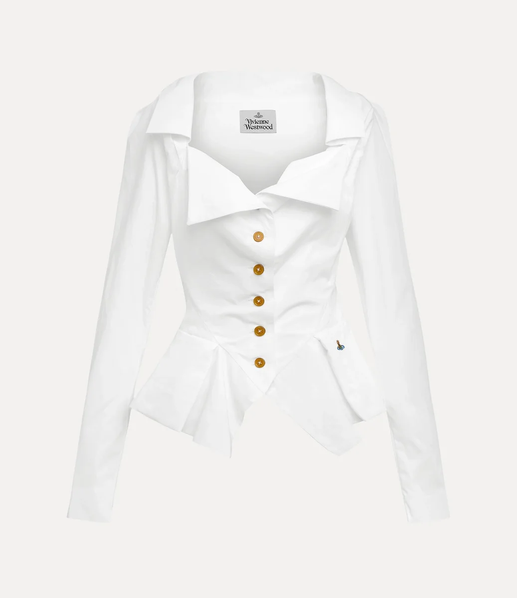 Koszula Monday ma origami-podobne fałdy materiału wokół dekoltu, ozdobione zapięciami na guziki z przodu i naszym charakterystycznym wielobarwnym haftem w kształcie kuli na biodrze. Model ten tworzy sylwetkę inspirowaną amerykańskim Środkowym Zachodem z lat 30. XX wieku, z dopasowanym stanikiem z rozkloszowanym, plisowanym przedłużeniem materiału w talii i eleganckimi bufiastymi ramionami.