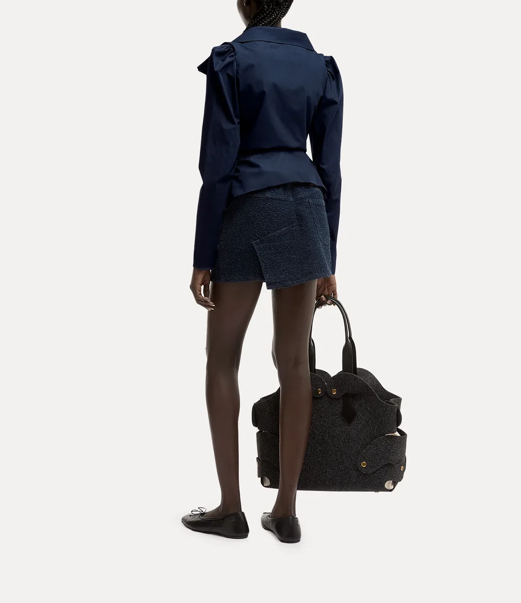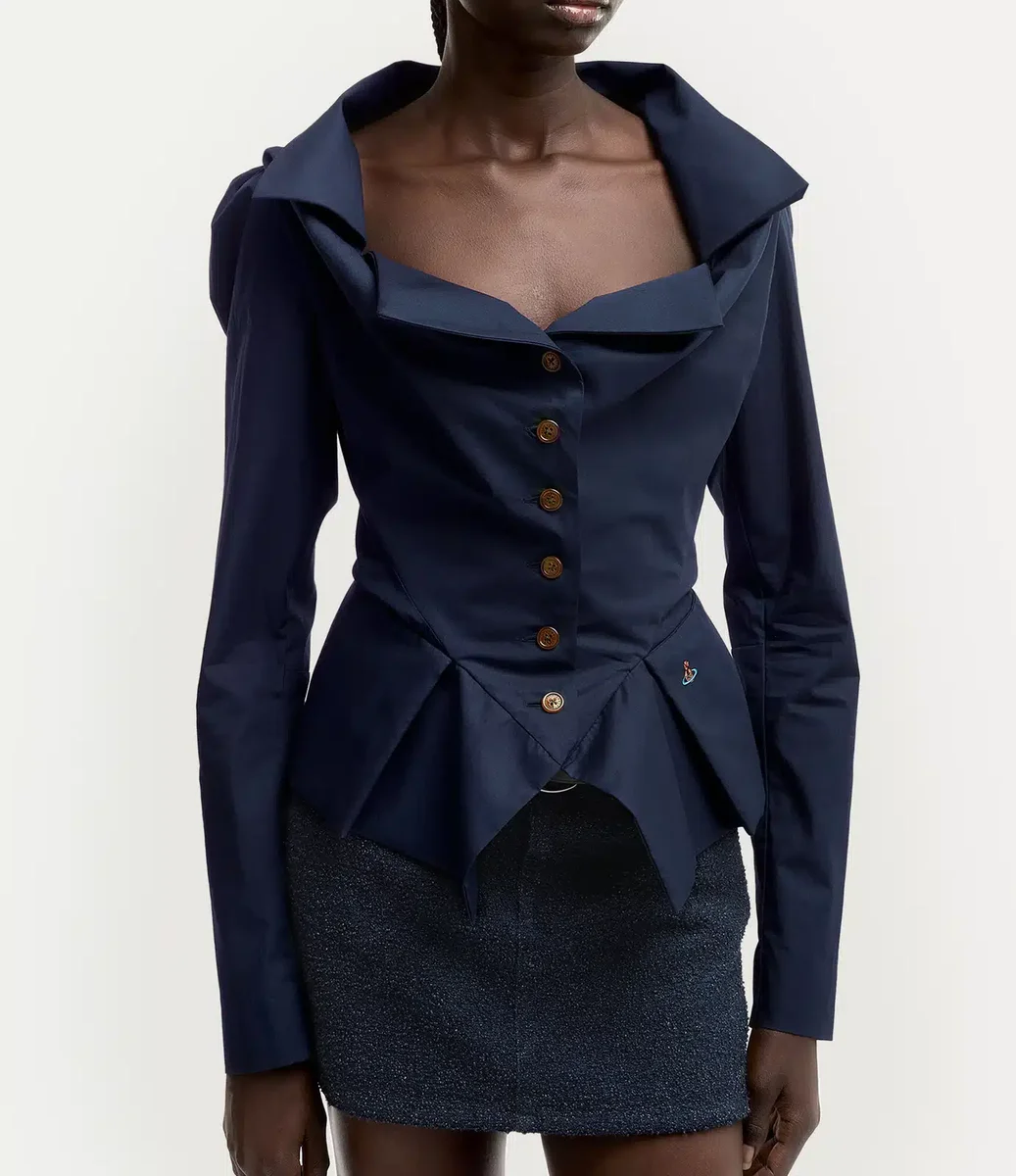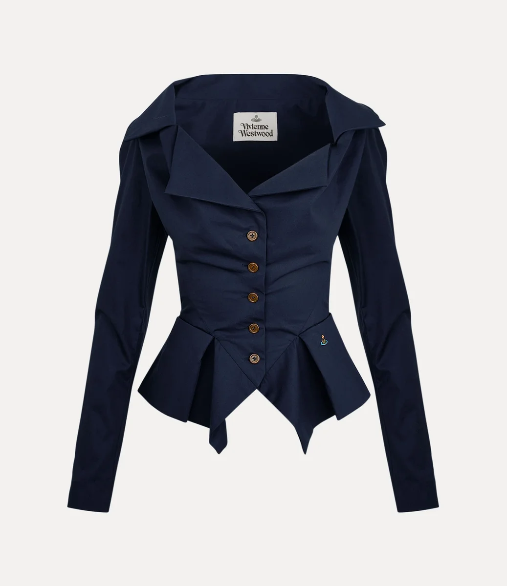 Nasza koszula Monday ma origami-podobne fałdy materiału wokół dekoltu, ozdobione guzikami z wygrawerowanymi literami oraz charakterystycznym dla naszej marki wielobarwnym haftem w kształcie kuli na biodrze. Model ma dopasowany stanik z rozkloszowanym, plisowanym przedłużeniem materiału w talii, zakończonym eleganckimi bufiastymi ramionami.