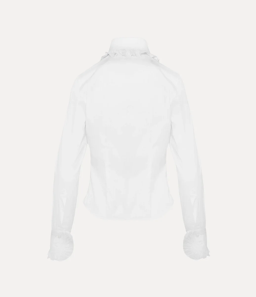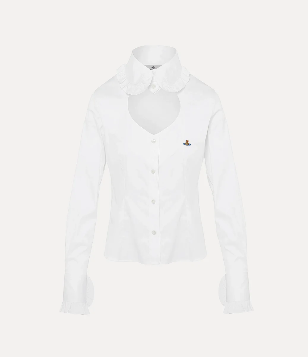 Koszula Toulouse Frill nawiązuje do naszego archiwalnego kroju z wycięciem w kształcie serca przy dekolcie, który jest synonimem sympatii Vivienne zarówno do ludzi, jak i do naszej planety. Koszula jest ozdobiona naszym charakterystycznym haftem w kształcie kuli na piersi, ma delikatnie zaokrąglony kołnierzyk i marszczone falbanki.