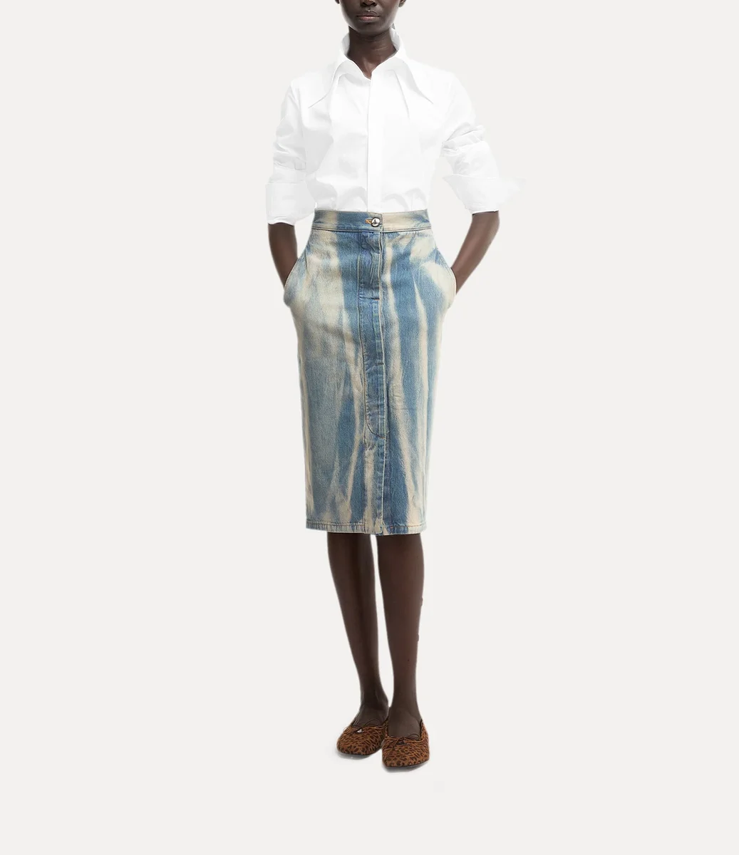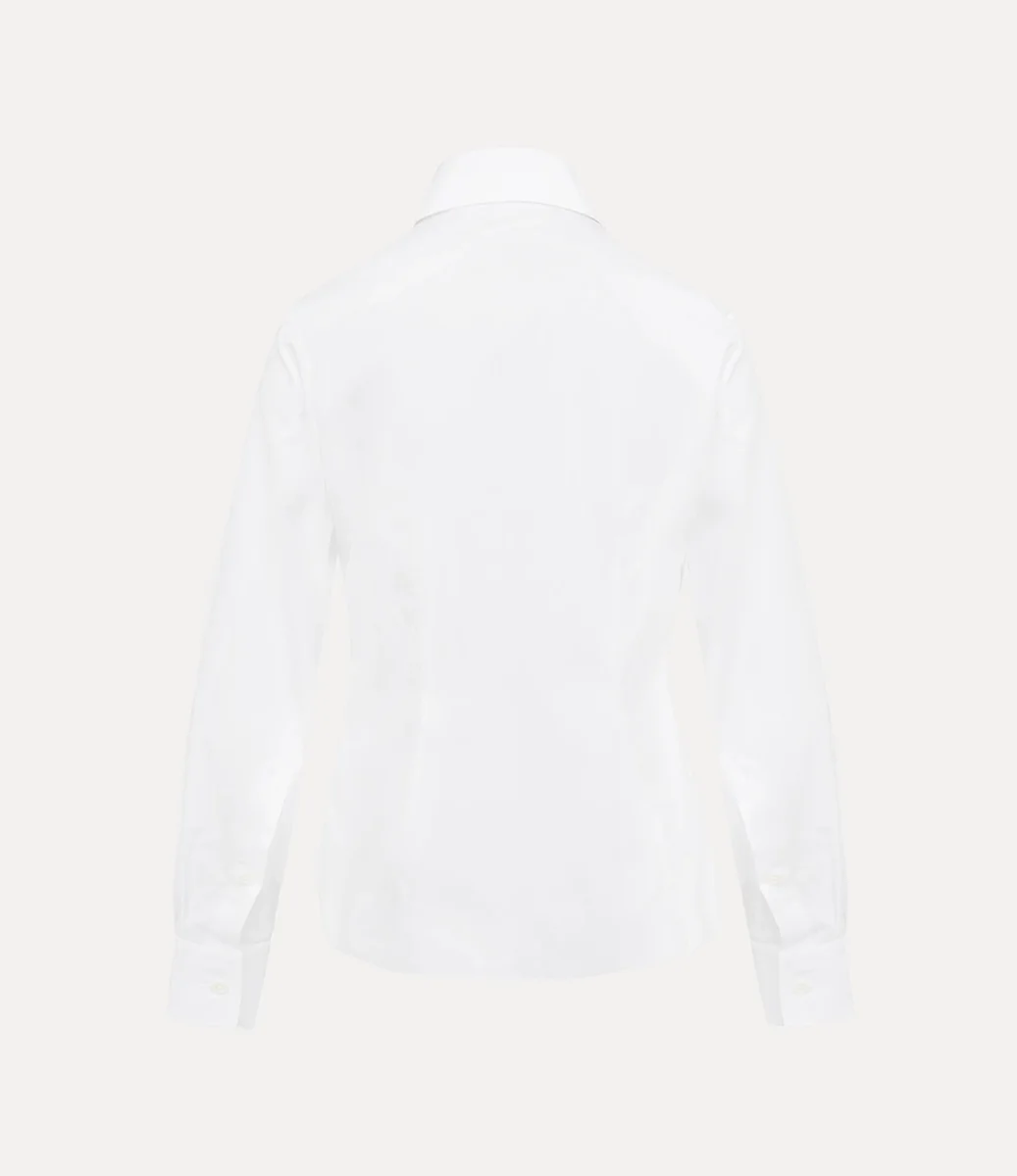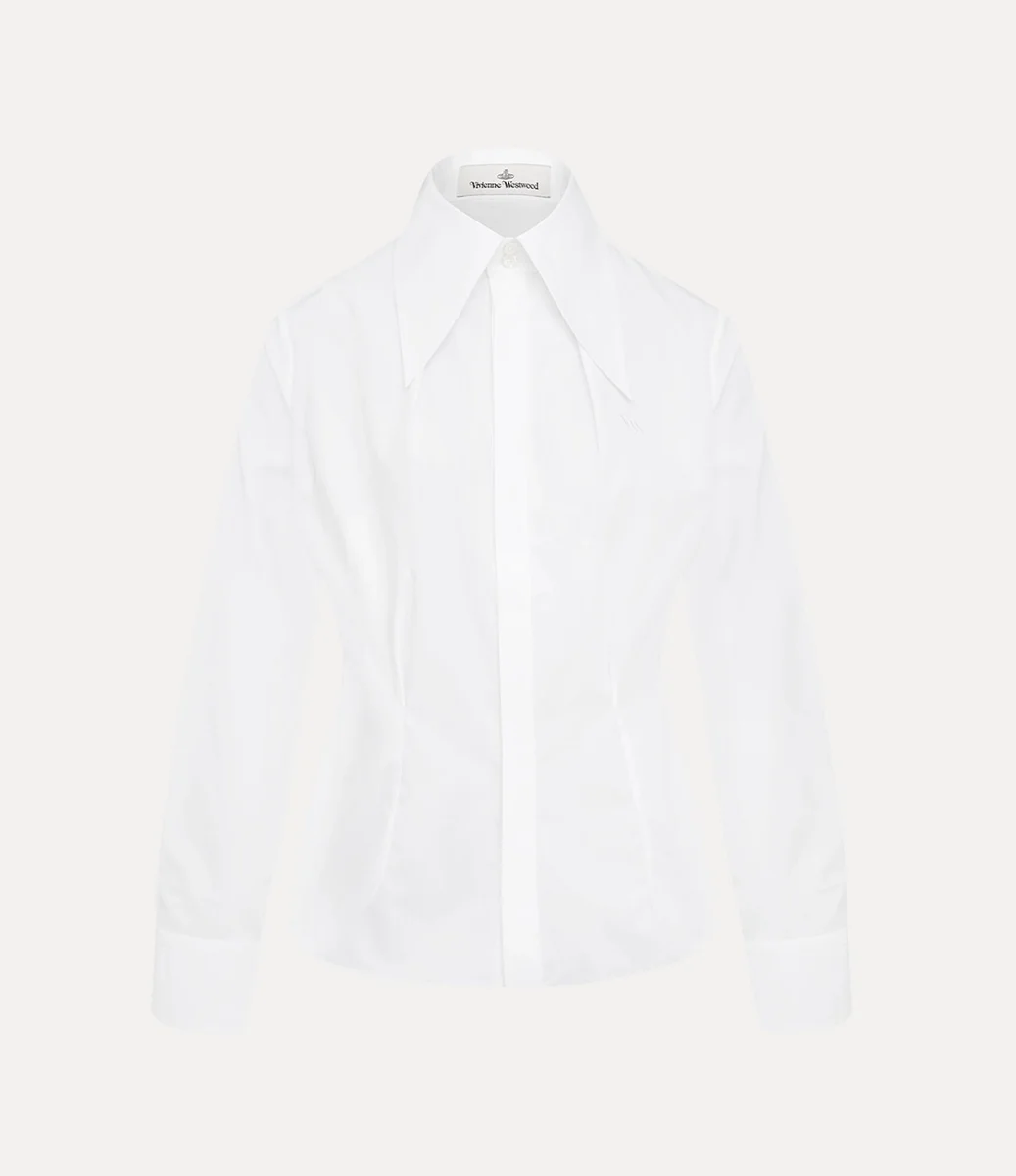 Nasza koszula Violin Tuxedo ma charakterystyczny dla marki kołnierzyk z dwoma guzikami oraz haftowany monogram „VW” po lewej stronie klatki piersiowej. Wykonana z miękkiej bawełny organicznej, ma wyrazisty, spiczasty kołnierzyk oraz delikatne zaszewki na biuście i w talii, które nadają jej wyprofilowany kształt.