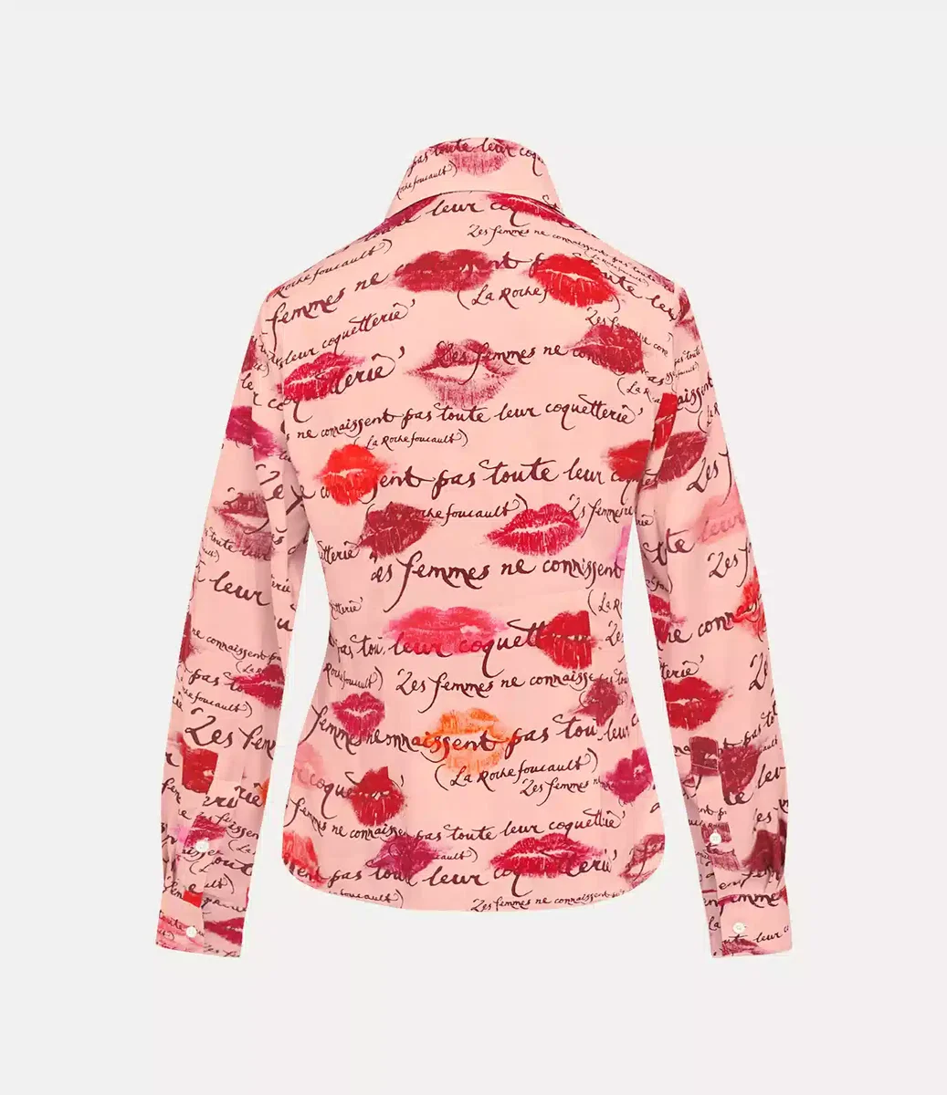 Nasza koszula smokingowa Violin ma charakterystyczny dla naszej marki kołnierzyk z dwoma guzikami, ozdobiony grafiką „Kisses”, inspirowaną opakowaniem naszych perfum „Boudoir”. Koszula ma wyrazisty, spiczasty kołnierzyk, a delikatne zaszewki w okolicy biustu i talii nadają jej wyprofilowany, dopasowany kształt.