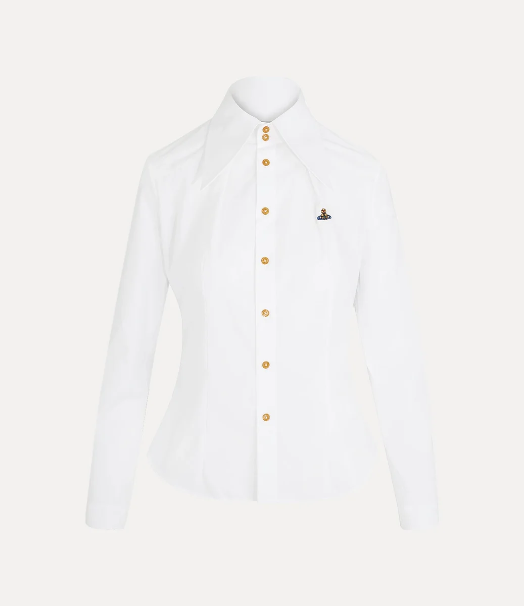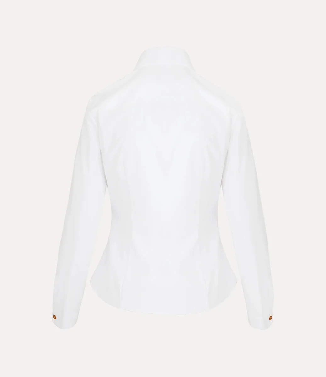 Nasza koszula W Violin o dopasowanym kroju ma przesadnie spiczasty kołnierzyk i charakterystyczne zapięcie na trzy guziki. Po lewej stronie klatki piersiowej znajduje się haftowana kula wykonana z żywych, wielobarwnych nici, symbolizująca wizję Vivienne dotyczącą przeniesienia tradycji w przyszłość.