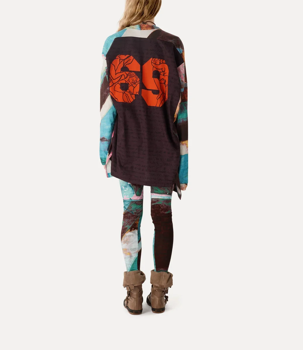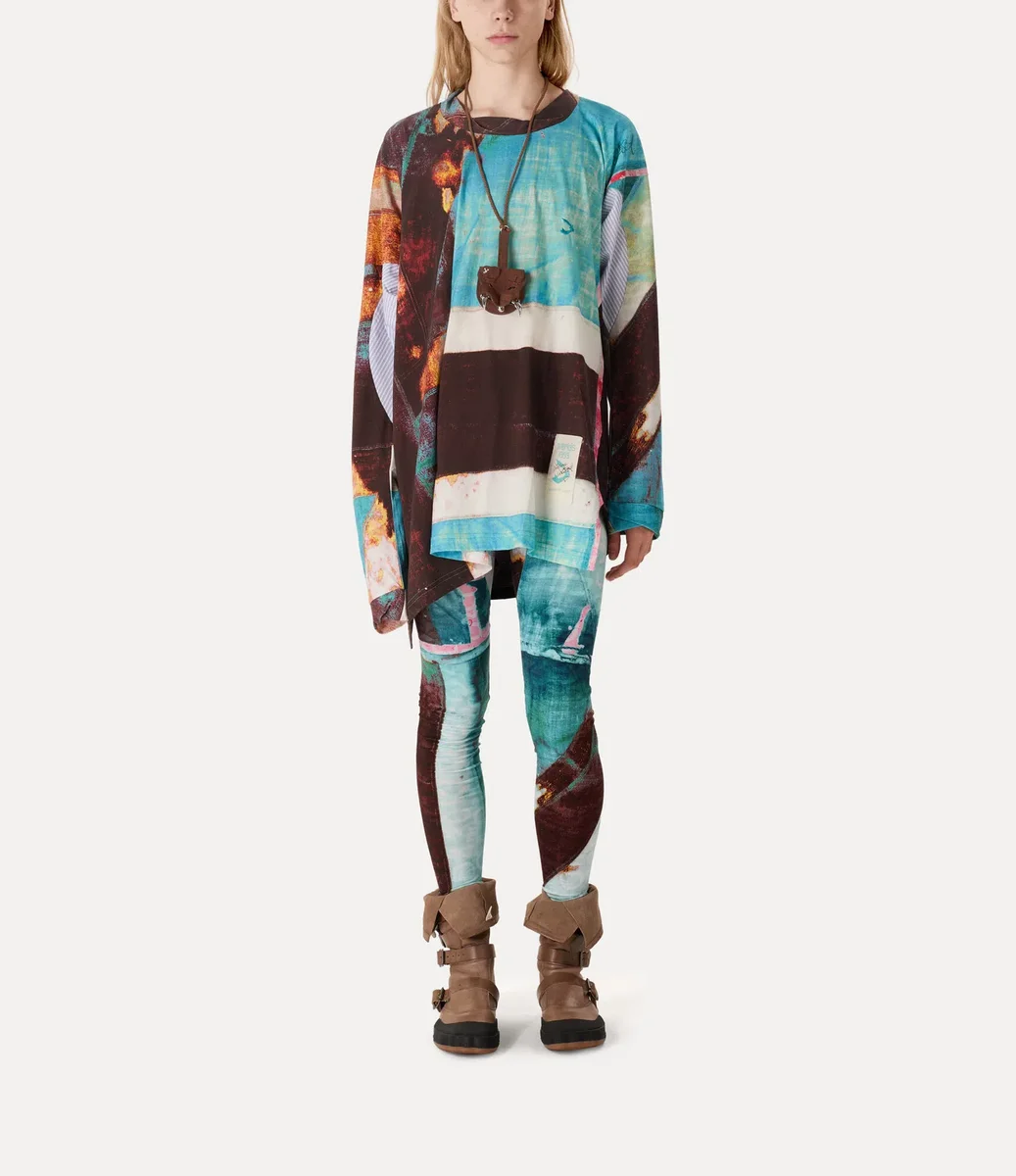 Bluzka Worlds End Drunken jest wykonana z miękkiej bawełny dżersejowej i ma żywy, wielobarwny nadruk charakterystyczny dla tego sezonu. Ma długie rękawy i asymetryczny krój, a jej detale to skręcone szwy przy dekolcie i mankietach oraz archiwalny haft „Arm and Cutlass” na piersi.