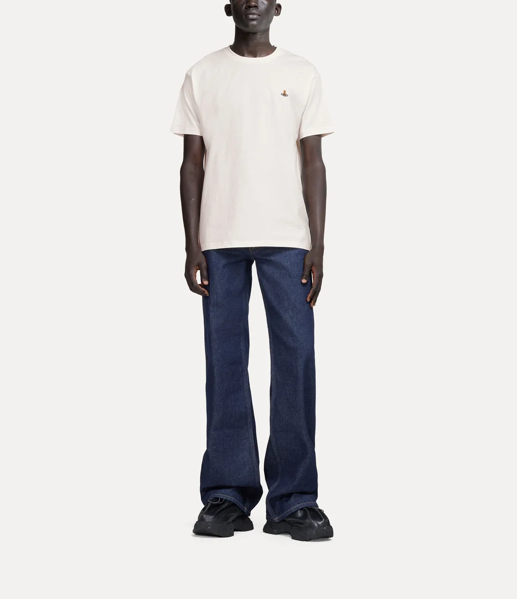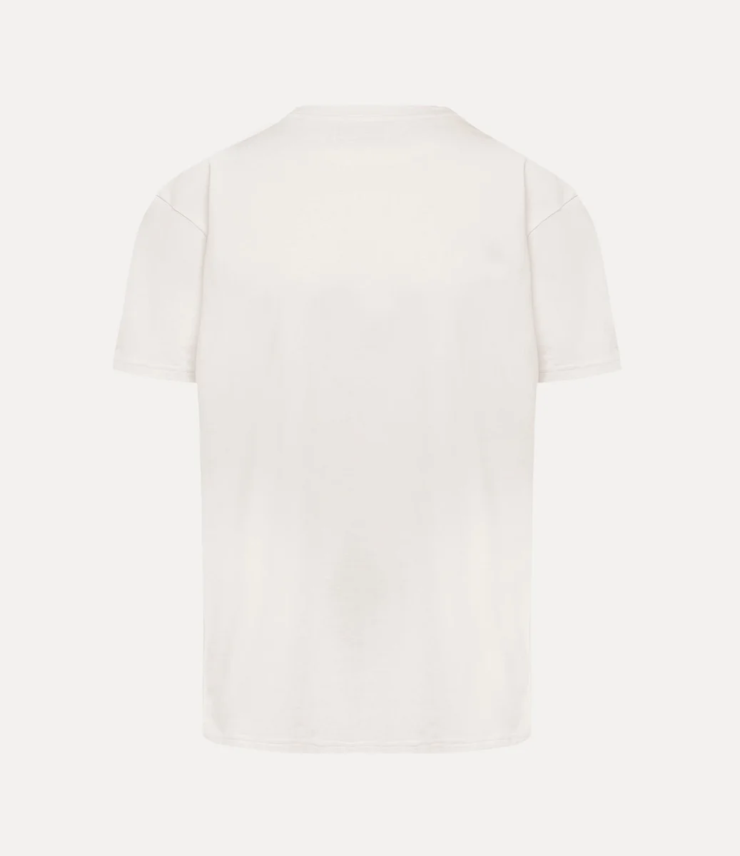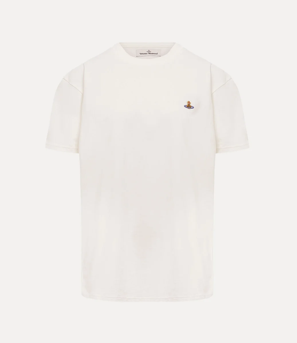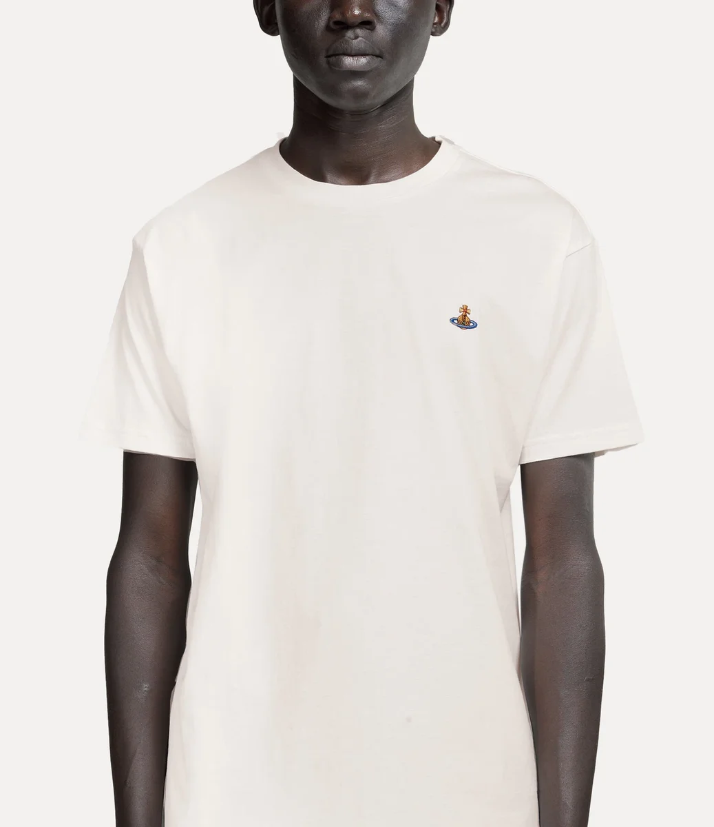 Nasza klasyczna koszulka ma miękki bawełniany krój, krótkie rękawy i okrągły dekolt. Po lewej stronie klatki piersiowej znajduje się wielobarwny haft w kształcie kuli, który symbolizuje wizję Vivienne dotyczącą przeniesienia tradycji w przyszłość.