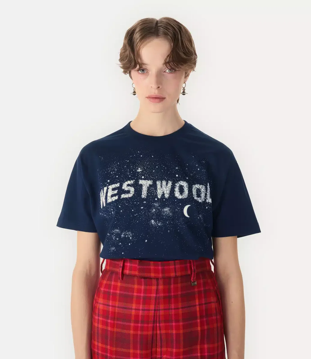 Koszulka Nana Classic, zaprojektowana wyłącznie dla kolekcji Vivienne Westwood X Nana, została wykonana z lekkiej bawełny i ma luźny krój z okrągłym dekoltem i krótkimi rękawami. Wykończona tonowymi szwami, ozdobiona jest nadrukiem przedstawiającym niebiańską grafikę „Westwood Galaxy”.