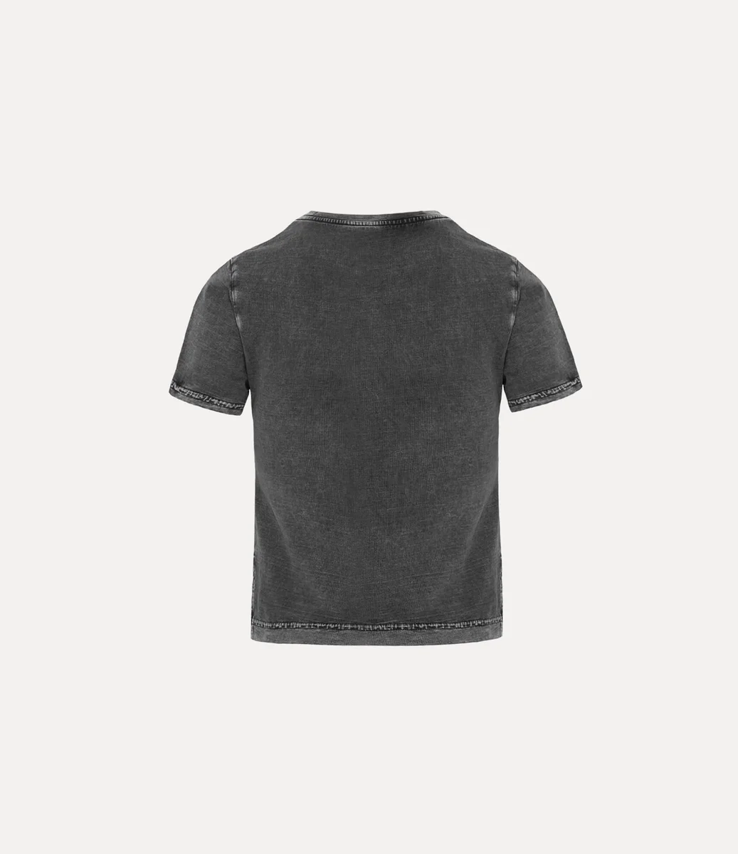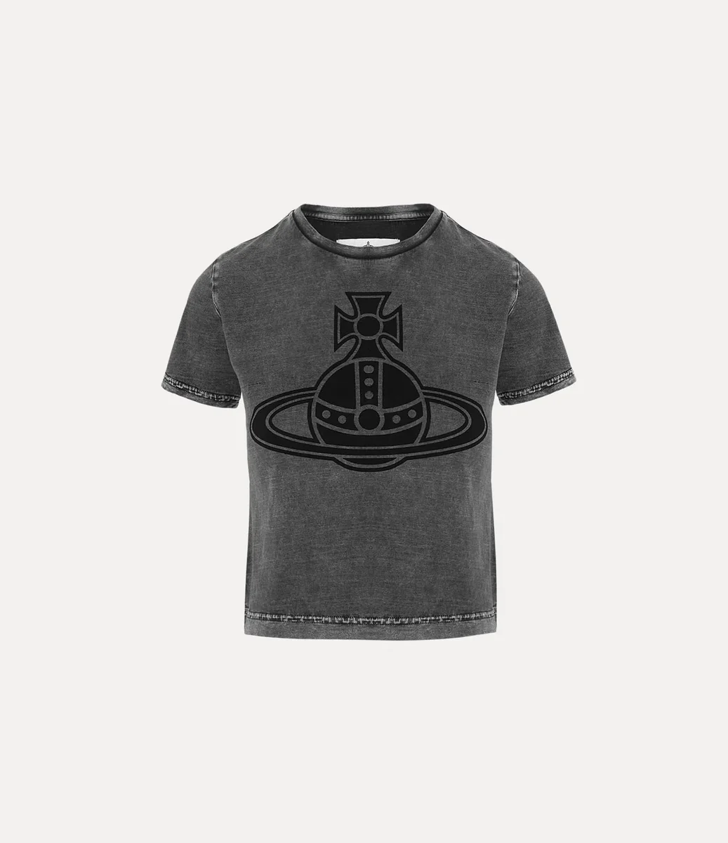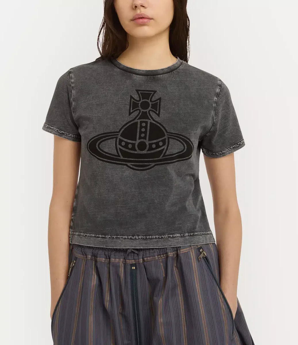 Nasza koszulka Paris Orb Mini Peru jest wykonana z lekkiej bawełnianej dzianiny dżersejowej, ma krój cropped i klasyczny okrągły dekolt, który przechodzi w asymetryczny, schodkowy dół. Ozdobiona motywem kuli, model ten odzwierciedla wizję Vivienne, polegającą na przenoszeniu tradycji w przyszłość.