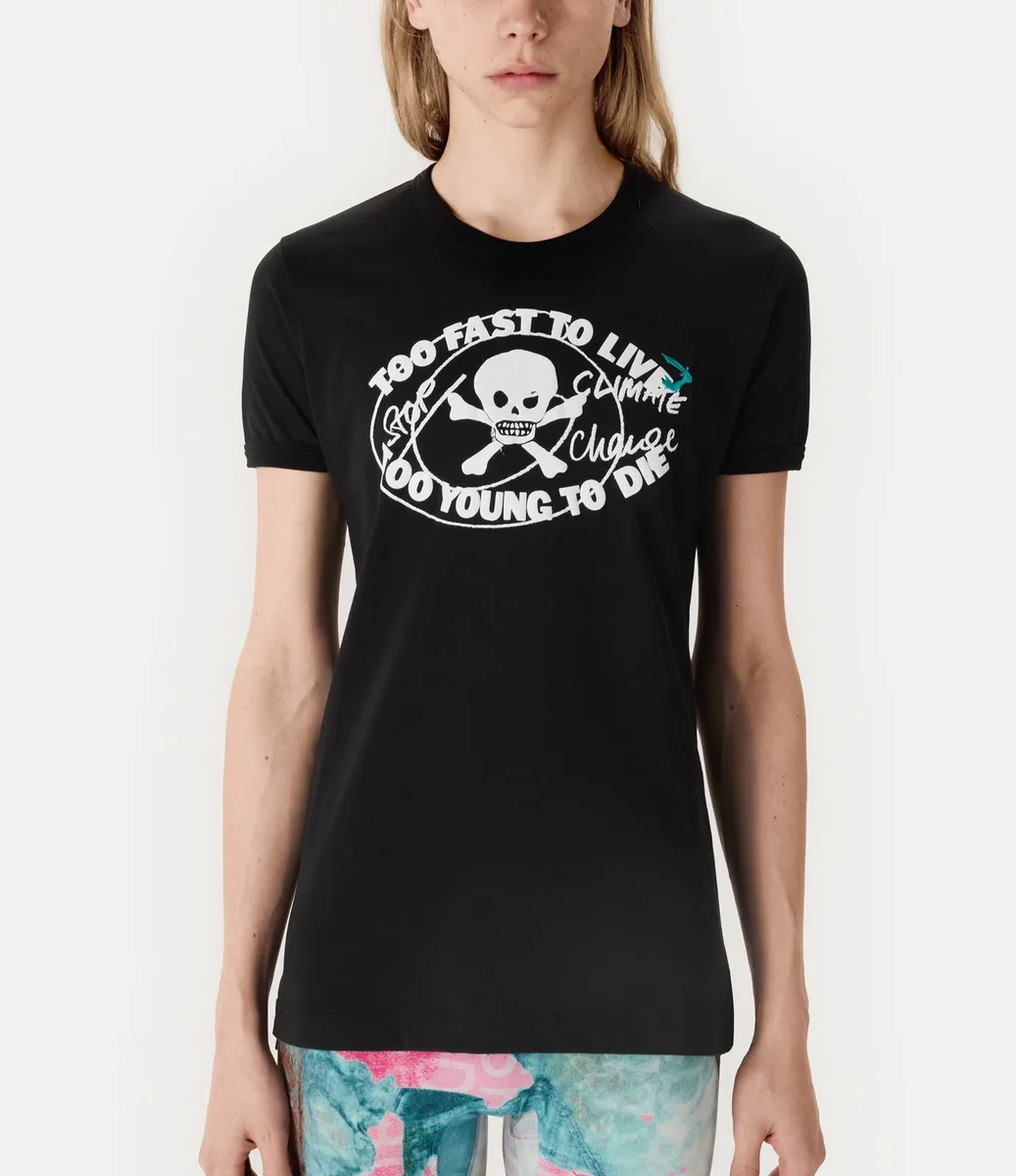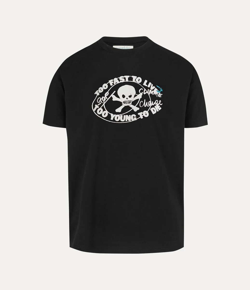 Nasza klasyczna koszulka Worlds End została wykonana z lekkiej bawełny, ma okrągły dekolt, krótkie rękawy i prosty dół. Projekt uzupełnia slogan „Too Fast to Live, Too Young to Die” (Zbyt szybki, by żyć, zbyt młody, by umrzeć), zaczerpnięty z szyldu naszego kultowego butiku, znanego obecnie jako Worlds’ End.