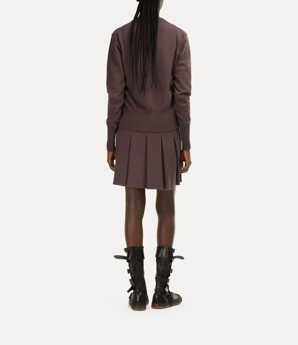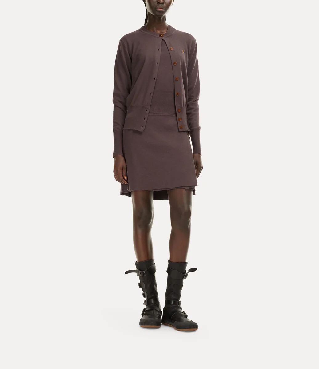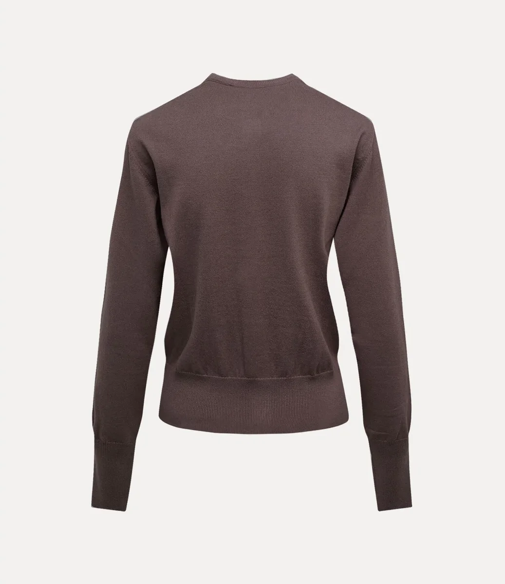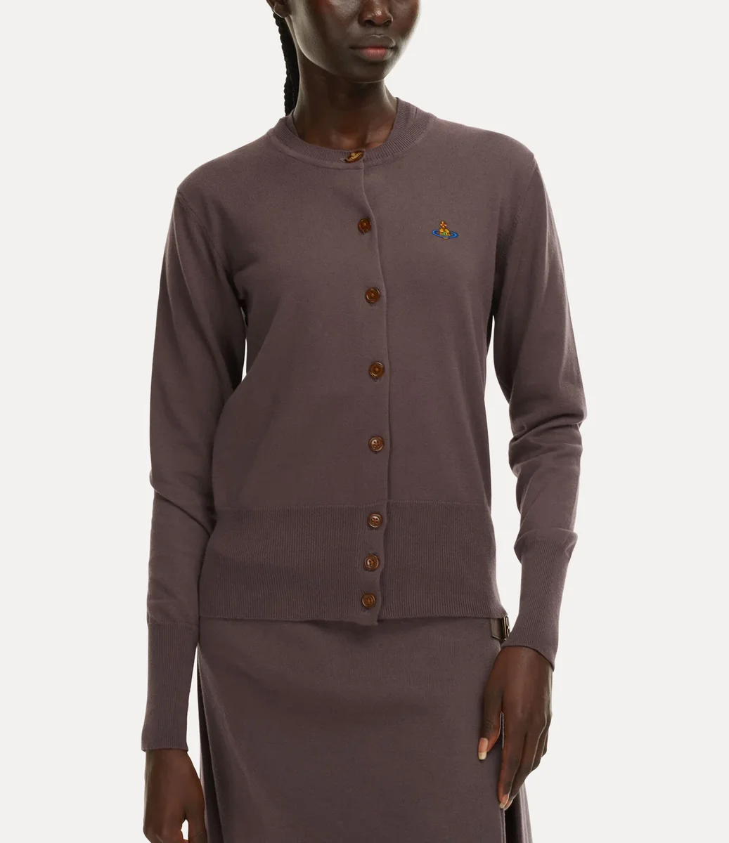 Nasz kardigan Bea ma bawełniano-kaszmirowy wykończenie, okrągły dekolt i dopasowany krój. Ubranie zdobią nasze charakterystyczne bursztynowe guziki, a na piersi znajduje się haftowana kula, symbolizująca wizję Vivienne dotyczącą przeniesienia tradycji w przyszłość.
